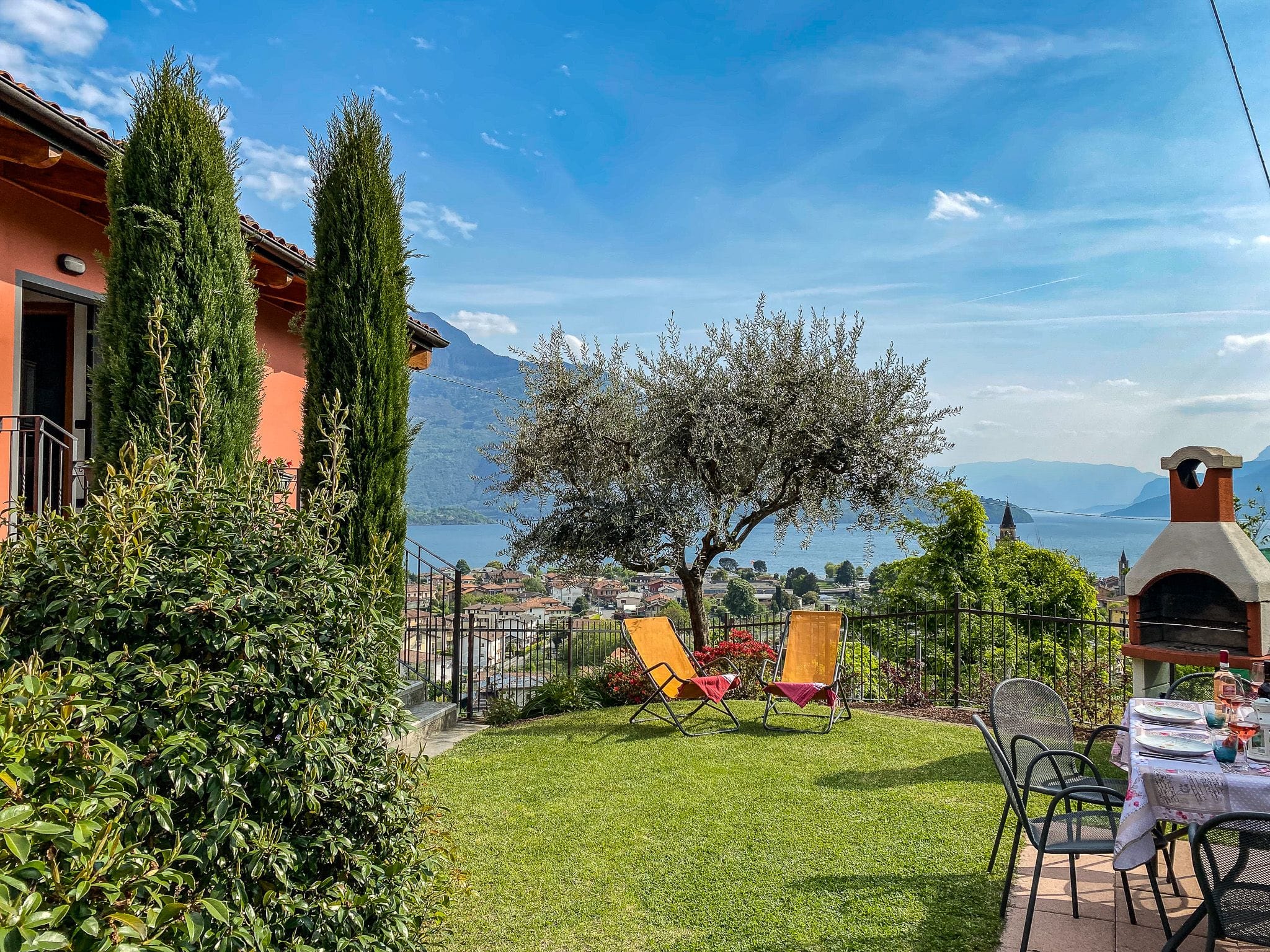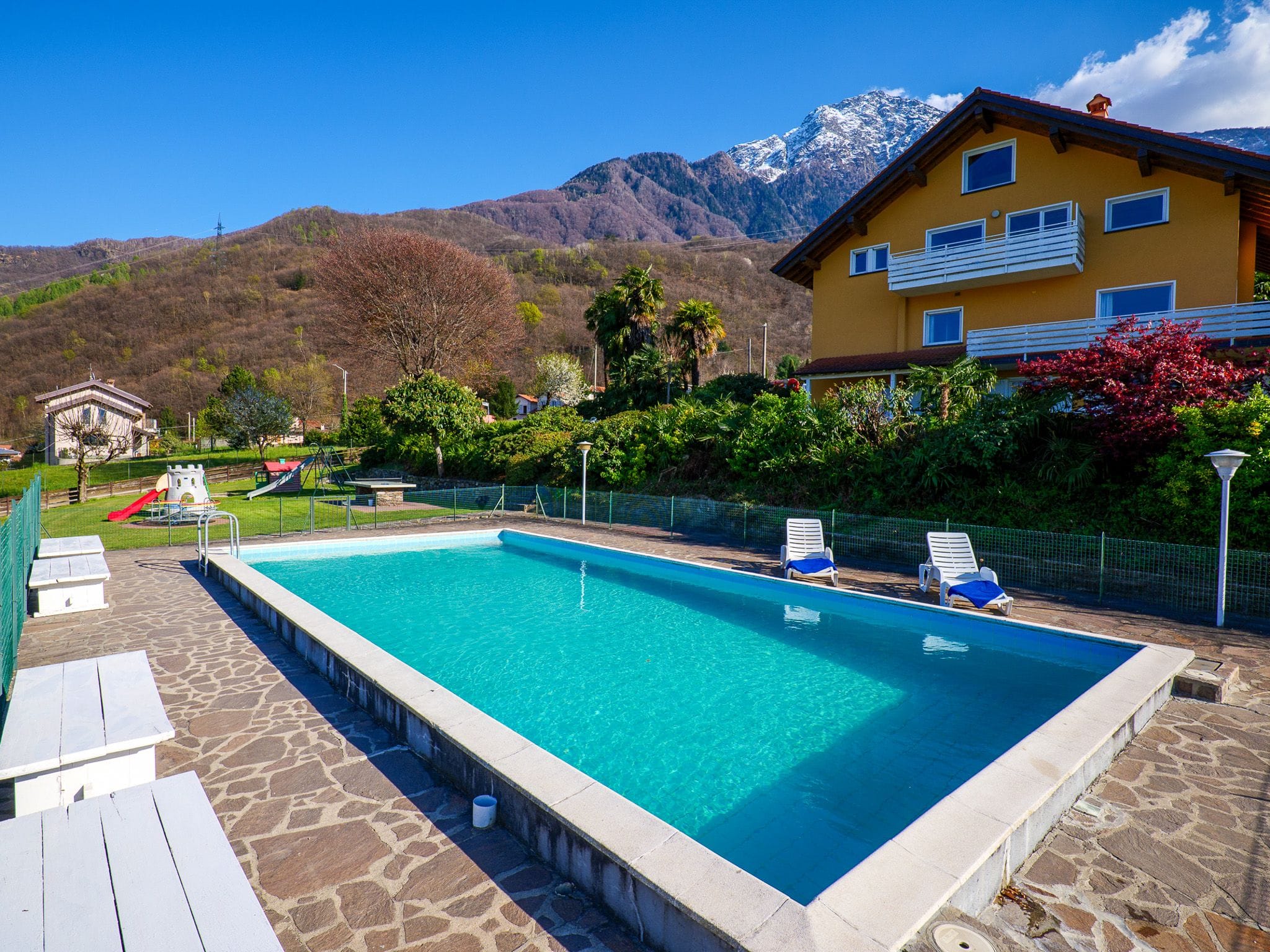 Das Ferienhaus del Sole liegt in einer Gartenoase oberhalb von Colico. Nahe der Bucht Piona in schöner Hanglage mit Blick auf die umliegende Bergkulisse, umgeben von Natur: Wiesen, Felder und ein Bergbach, einigen Wohnhäusern in der Nachbarschaft. Sie erwartet ein idyllischer, großer Garten mit vielen Palmen, Obstbäumen und blühenden Sträuchern. Zur Gartenseite ist der solarbeheizte, unterwasserbeleuchtete Pool und das Kinderpool sowie die Gartenspielgeräte mit Blick auf den Hausberg Monte Legnone, den See und das Alpenpanorama.