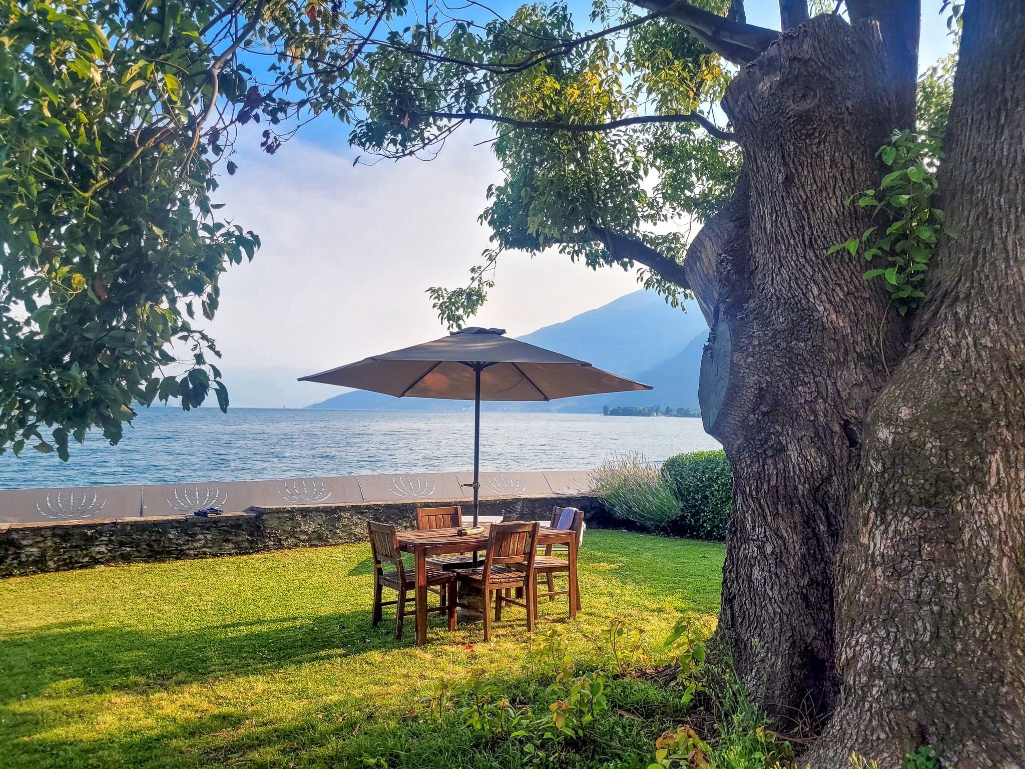 Die Ferien-Villa „Mimosa“ mit zwei Ferienwohnungen liegt in paradiesischer Hanglage eingebettet in die hügelige Landschaft nur 250 m vom See entfernt und hat einen faszinierenden Blick bis weit in den Süden des Sees und die umliegenden Berge. Die Villa ist umgeben von viel Natur und schönen Villen und Wohnhäusern. Der Garten zur Seeseite ist ideal zum Sonnenbaden. Ein Highlight ist der Steingarten rund um das Haus, der mit Palmen und anderen südlichen Pflanzen bewachsen ist. Zum Garten mit Pool und Barbecue hin gibt es ein gemütliches Kaminzimmer mit rustikaler Sitzgruppe mit Platz für alle, mit Brett- und Kartenspielen, ideal für private Familienfeiern in Absprache.
