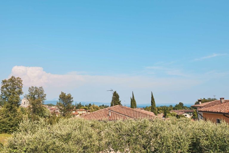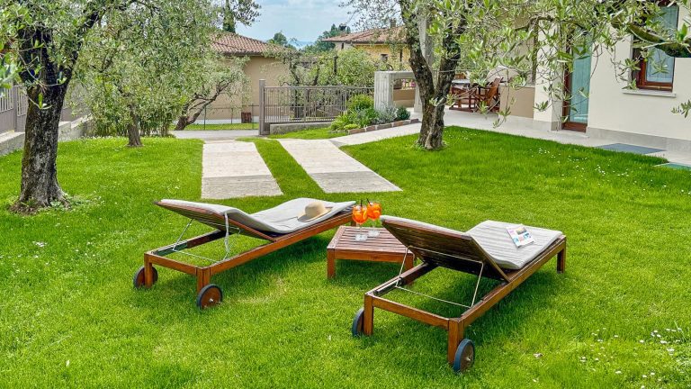 Urlaub im Lande – mit privatem Umfeld, wie man es am Gardasee wenig kennt: Zwei komfortable und moderne Ferienhäuser von Privat mit idyllischem Olivengarten oberhalb des historisch-pittoresken Seedorfes San Felice del Benaco. am südlichen Ufer des Gardasees in leichter Hanglage mit kleinem Seeblick. In bevorzugter erholsamer Wohnlage auf einem Hügelkamm oberhalb des Dorfes. Die Anwohnerstraße endet am Ferienhaus, in alle Himmelsrichtungen genießen Sie weiten Blick auf Wiesen und Olivenhaine. Der Garten bietet viel Platz zum Spielen und Relaxen in Sonne und Schatten, eine große überdachte Terrasse lädt ein sämtliche