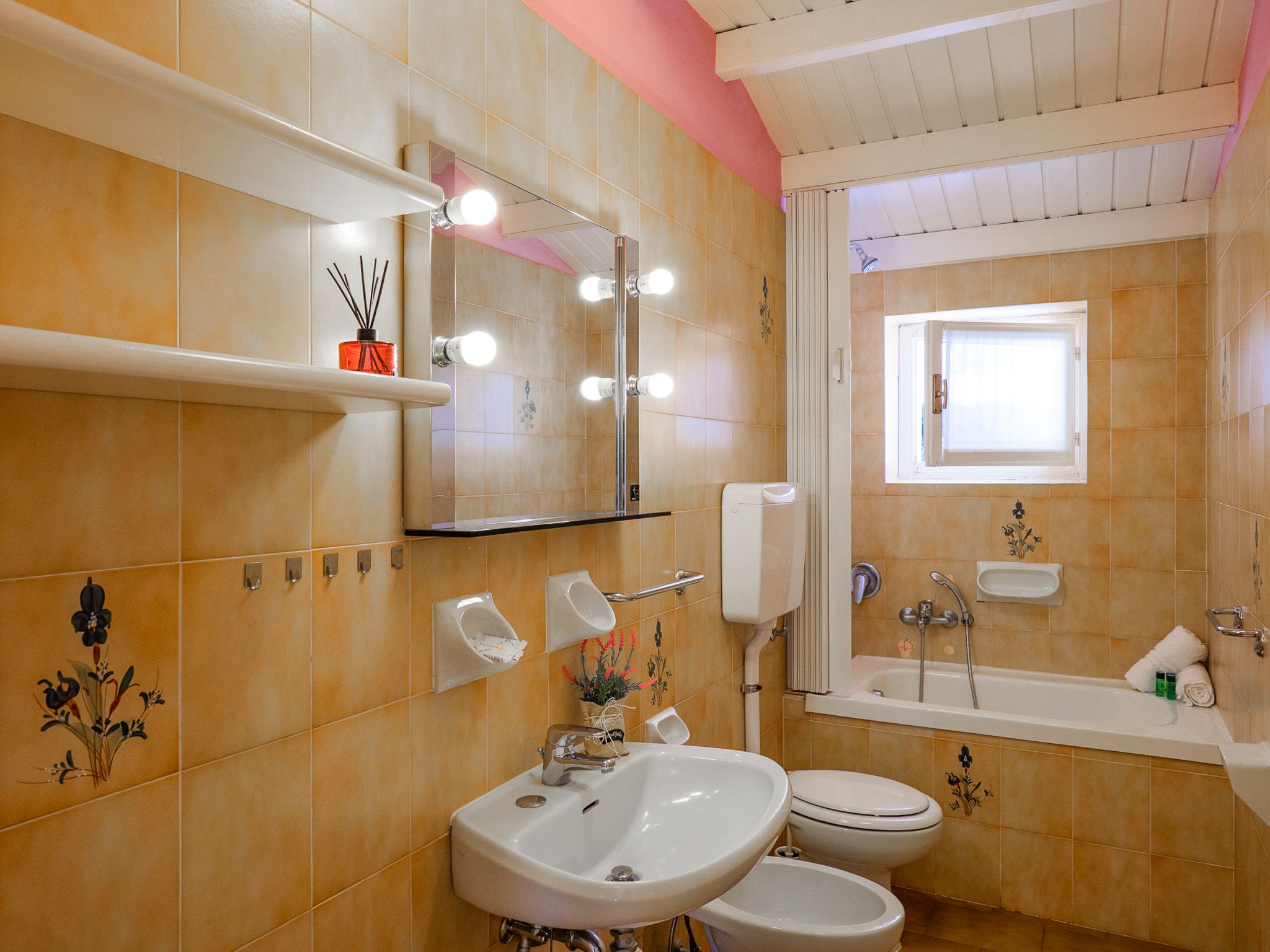 Das Bad ist mit kleiner Badewanne/Duschabtrennung.