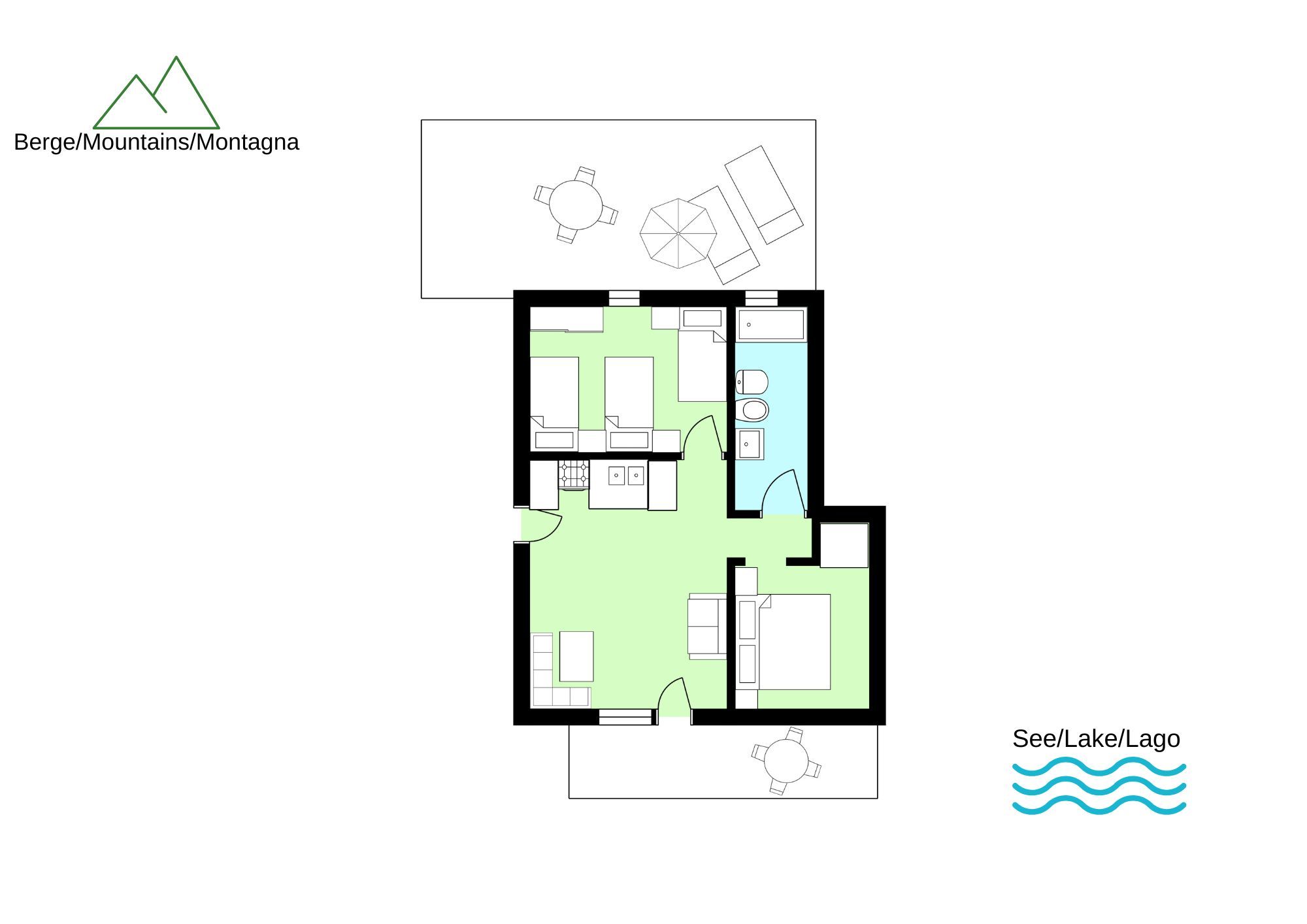 Die Sonnenterrasse führt in den hellen Wohn- und Essbereich mit seitlicher Einbauküche, Wohnbereich mit Doppelbettcouch zur Seeseite mit Zugang auf den breiten Balkon mit kleinem Seeblick.
