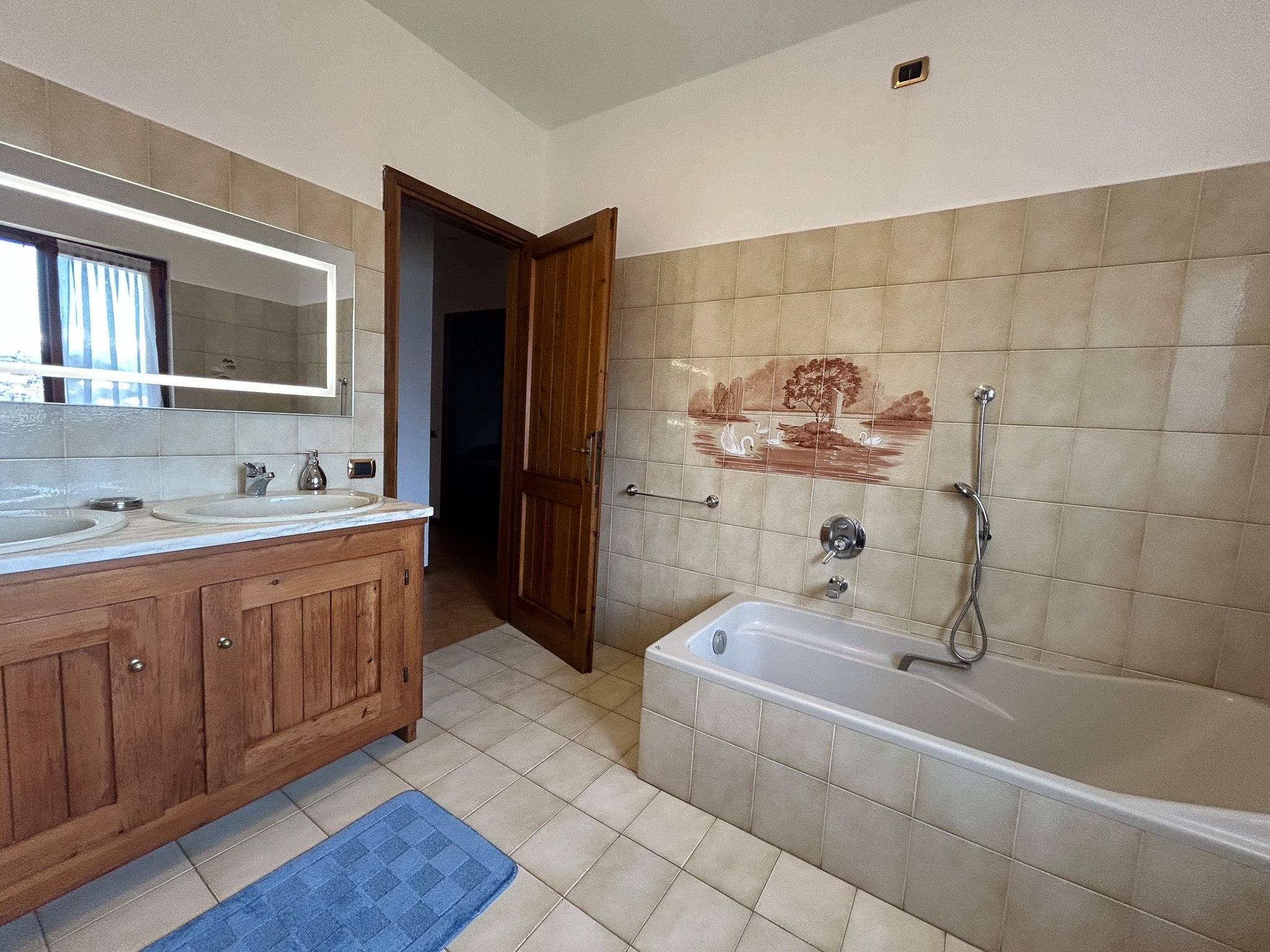 Das große Badezimmer beeindruckt mit einer herrlichen Aussicht, einem großzügigen Waschtisch mit zwei Waschbecken, einer Badewanne, WC und Bidet. Ergänzend dazu gibt es ein weiteres kleines Bad mit WC und Bidet sowie ein separates Bad mit Dusche und Waschbecken.