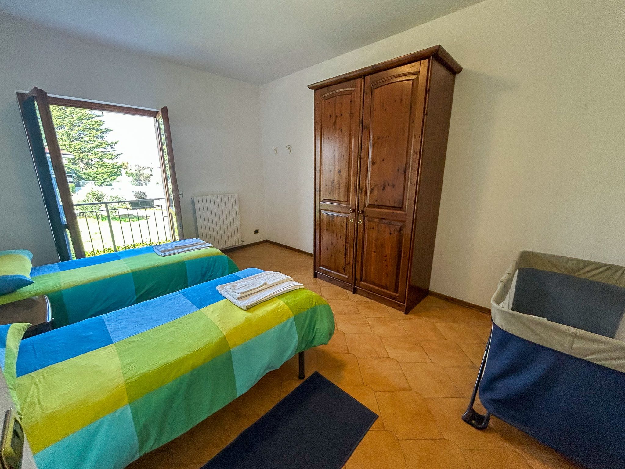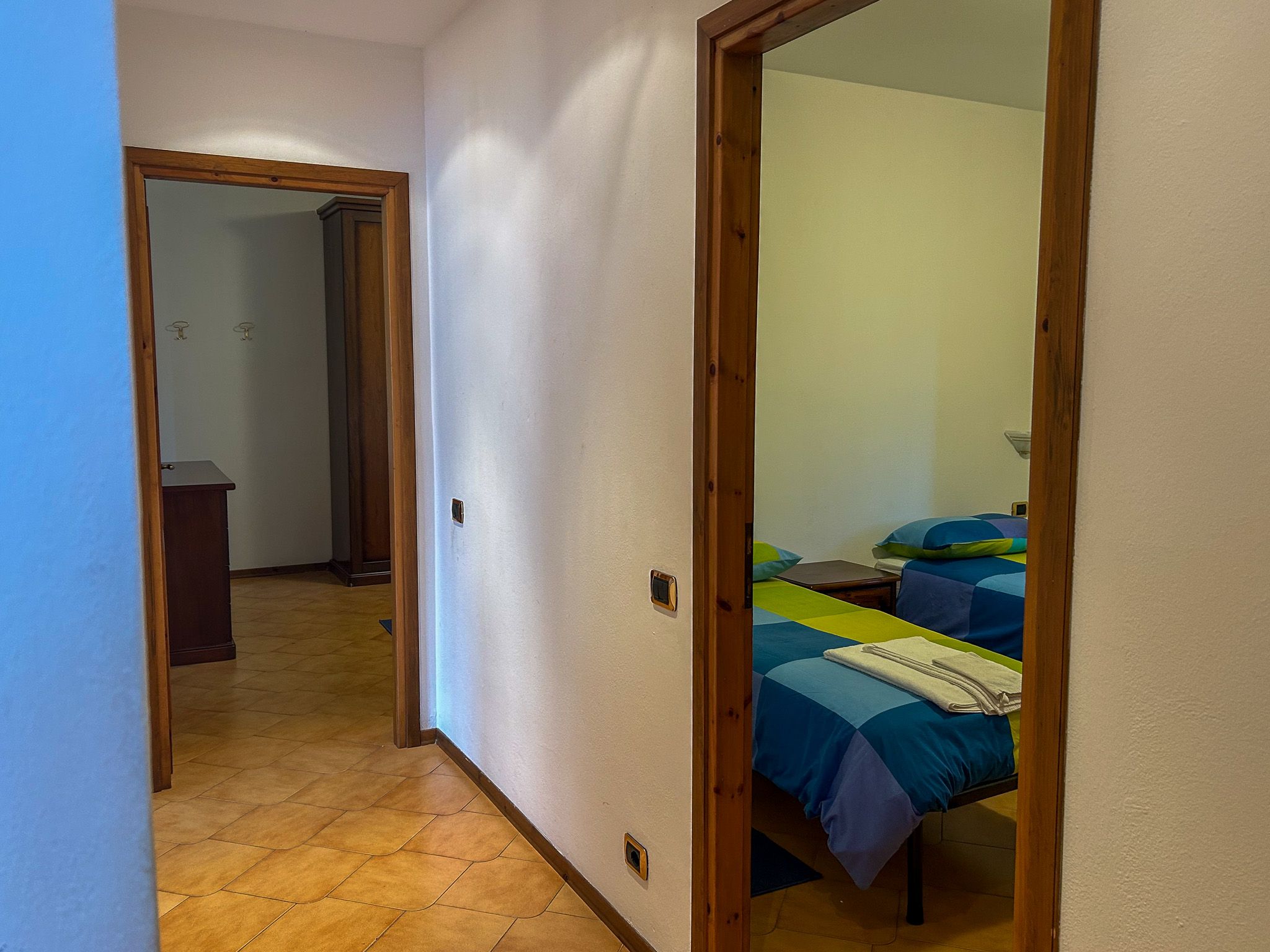 Ein Flur verbindet das Wohnzimmer mit den Schlaf- und Badezimmern. Seitlich angeordnet finden Sie drei Schlafzimmer: ein Doppelzimmer, ein Zweibettzimmer sowie ein weiteres Zweibettzimmer mit zusätzlichem Babybett – ideal für Familien.