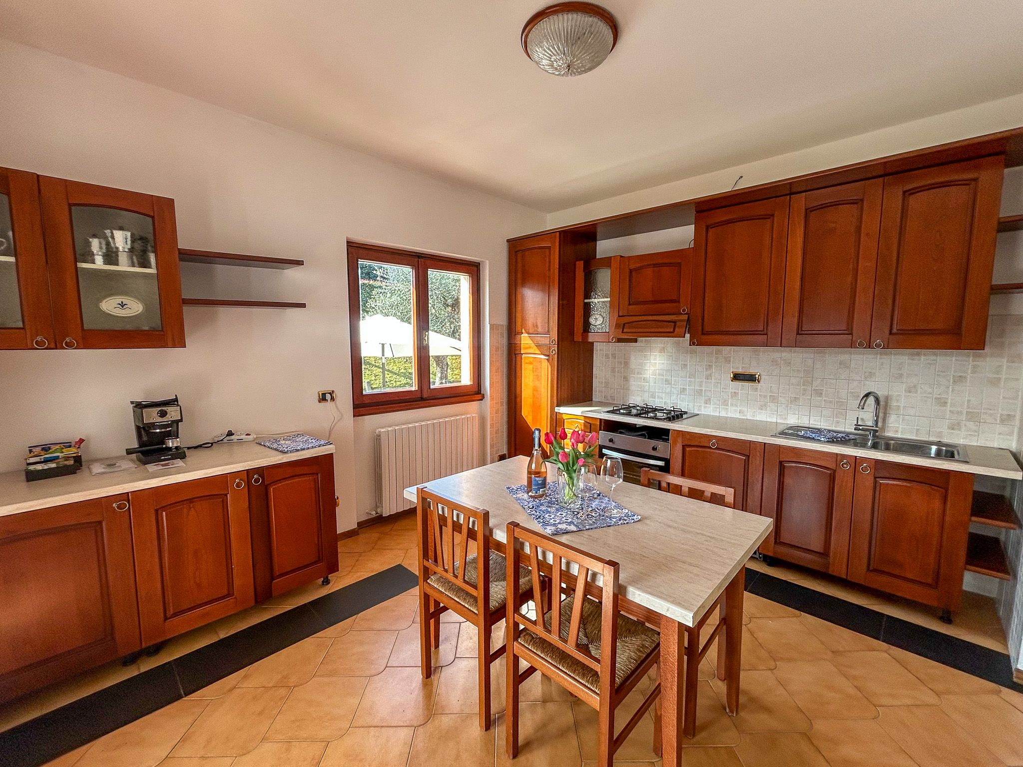 Sie gelangen in die Ferienwohnung auf der bergseitigen Rückseite des Hauses über die überdachte Veranda direkt in die helle, geräumige Küche. Die Wohnung ist schlicht und stilvoll eingerichtet und gewinnt durch lichtdurchflutete Räume mit charmanten lombardischen Holzmöbeln.