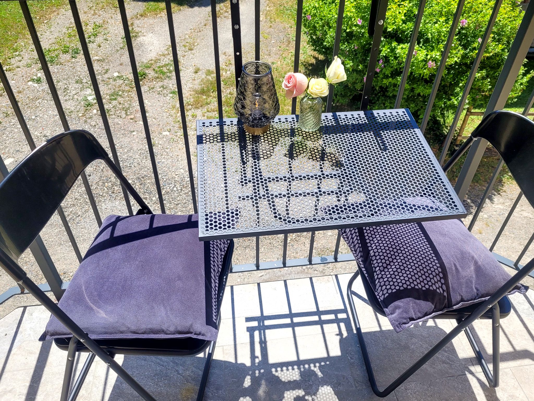 Der angrenzende Balkon bietet Platz für einen Tisch und zwei Stühlen, von denen Sie den herrlichen Ausblick auf die Berge genießen können.