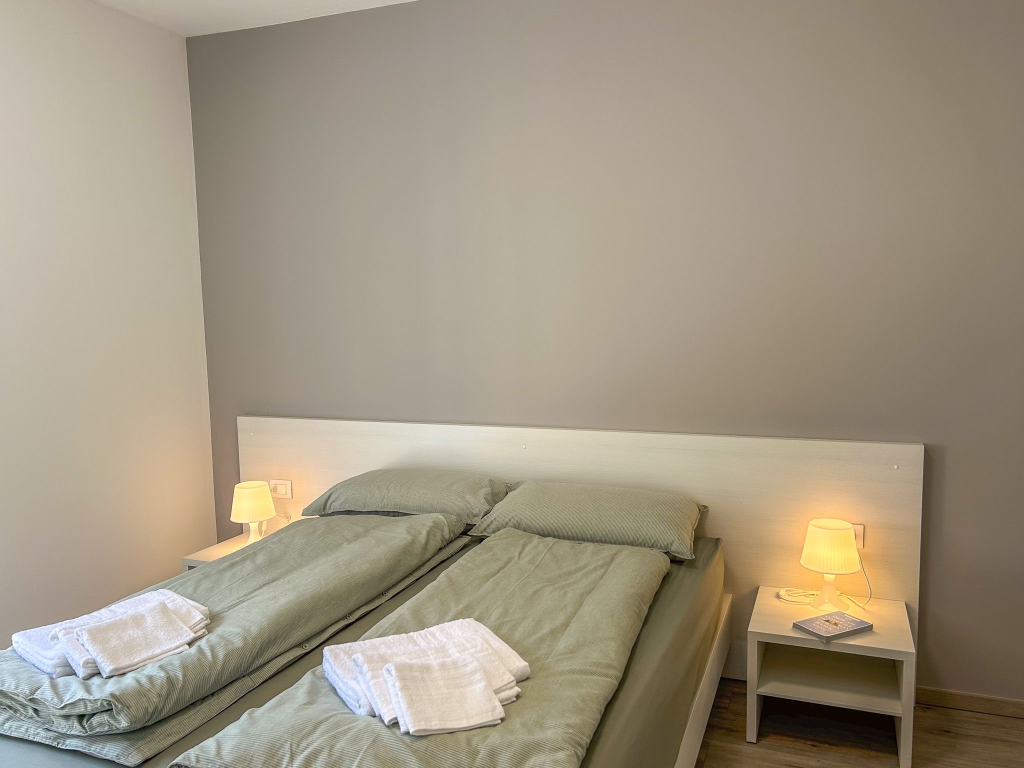 Das geräumige Schlafzimmer mit komfortablem Doppelbett, Kleiderschrank und Nachttischen befindet sich am Ende des Flurs.