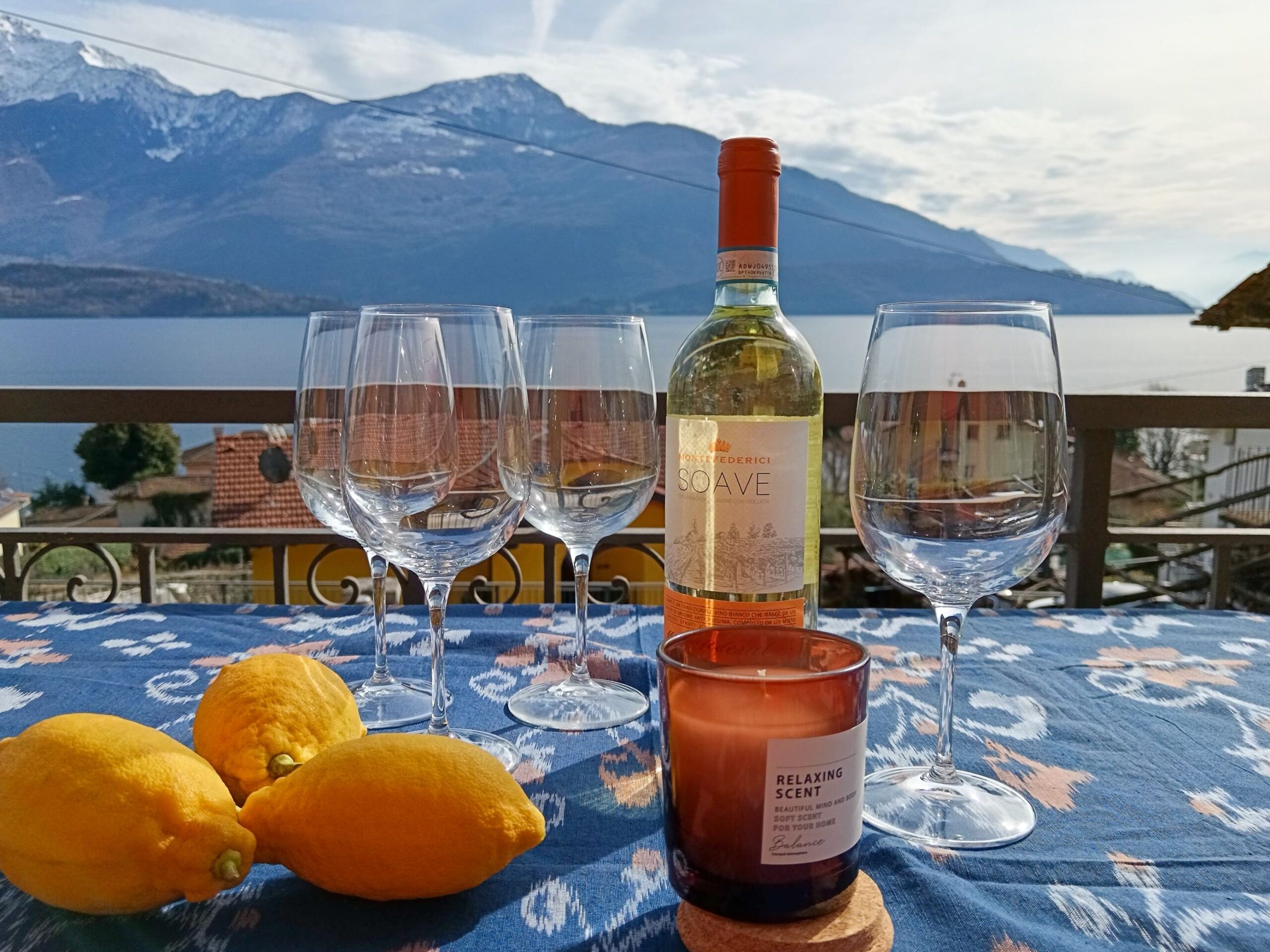 Bergseitig auf der Rückseite des Hauses gelangen Sie in die Ferienwohnung Augusta. Auf der Seeseite befindet sich das helle Wohn- und Esszimmer mit Balkon. Von hier aus genießen Sie einen herrlichen Panoramablick auf den Comer See und die umliegenden Berge – ob morgens bei einer Tasse Kaffee oder abends entspannt bei einem Glas Wein.