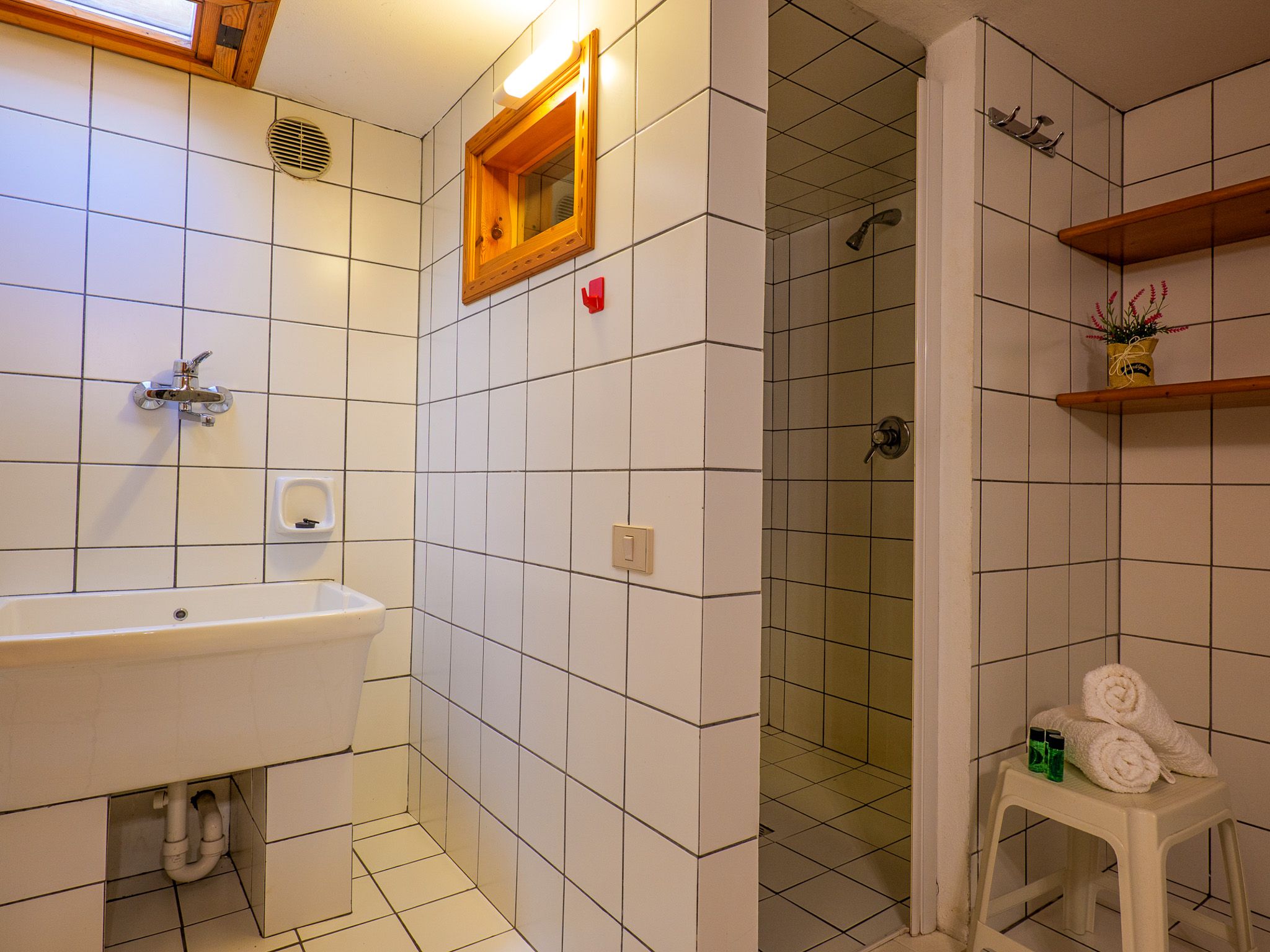 Der Flur führt in das Doppel- und Zweibettzimmer sowie in das Bad und zur Bergseite in einen Lebensmittel-Keller (auch Platz für Bikes etc.). Das helle, geräumige Bad ist mit Dusche.