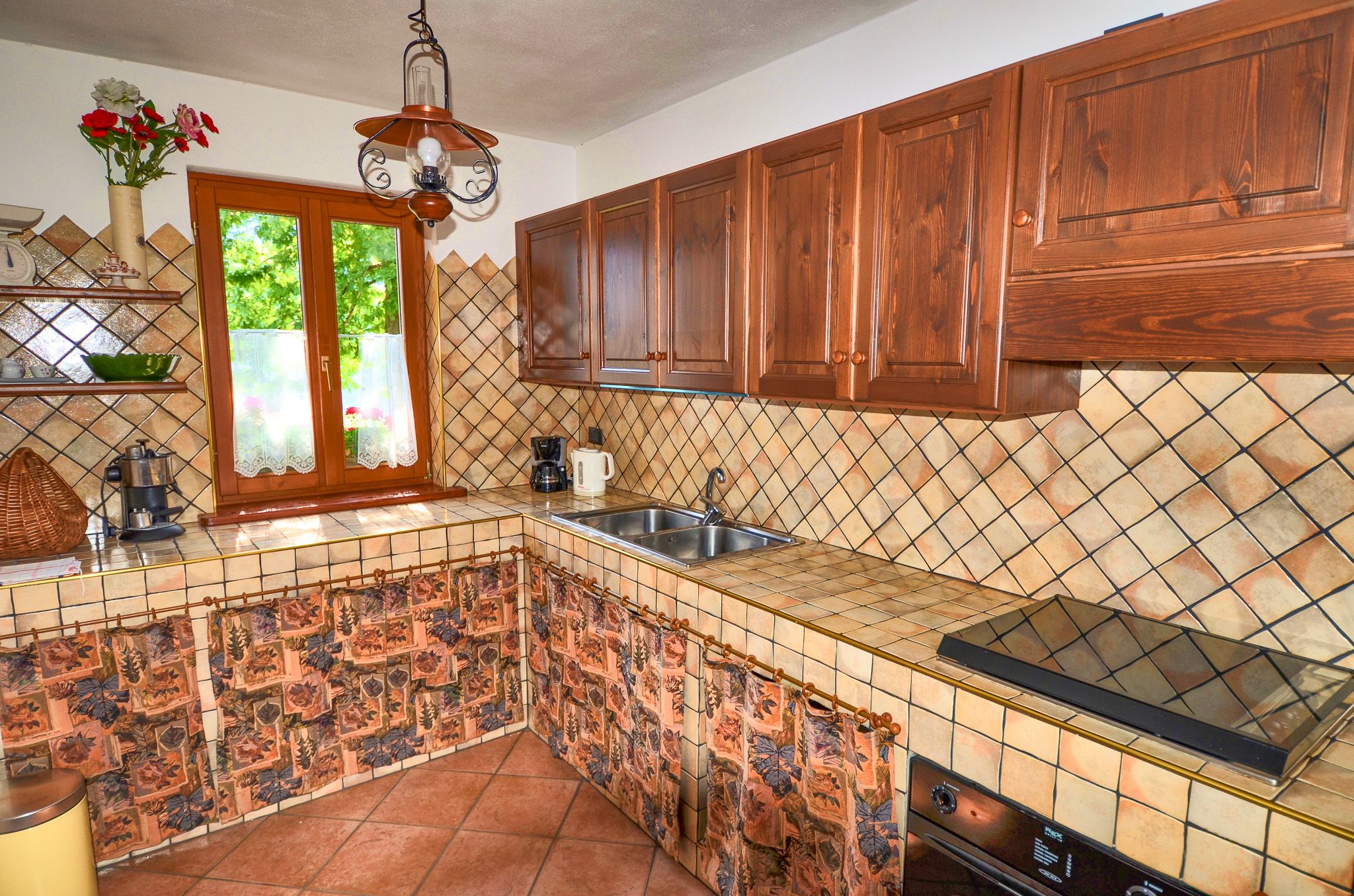 Die Einrichtung ist aus Vollholzmöbel, gemauerter Küche, Granit und hellem Fliesenboden.