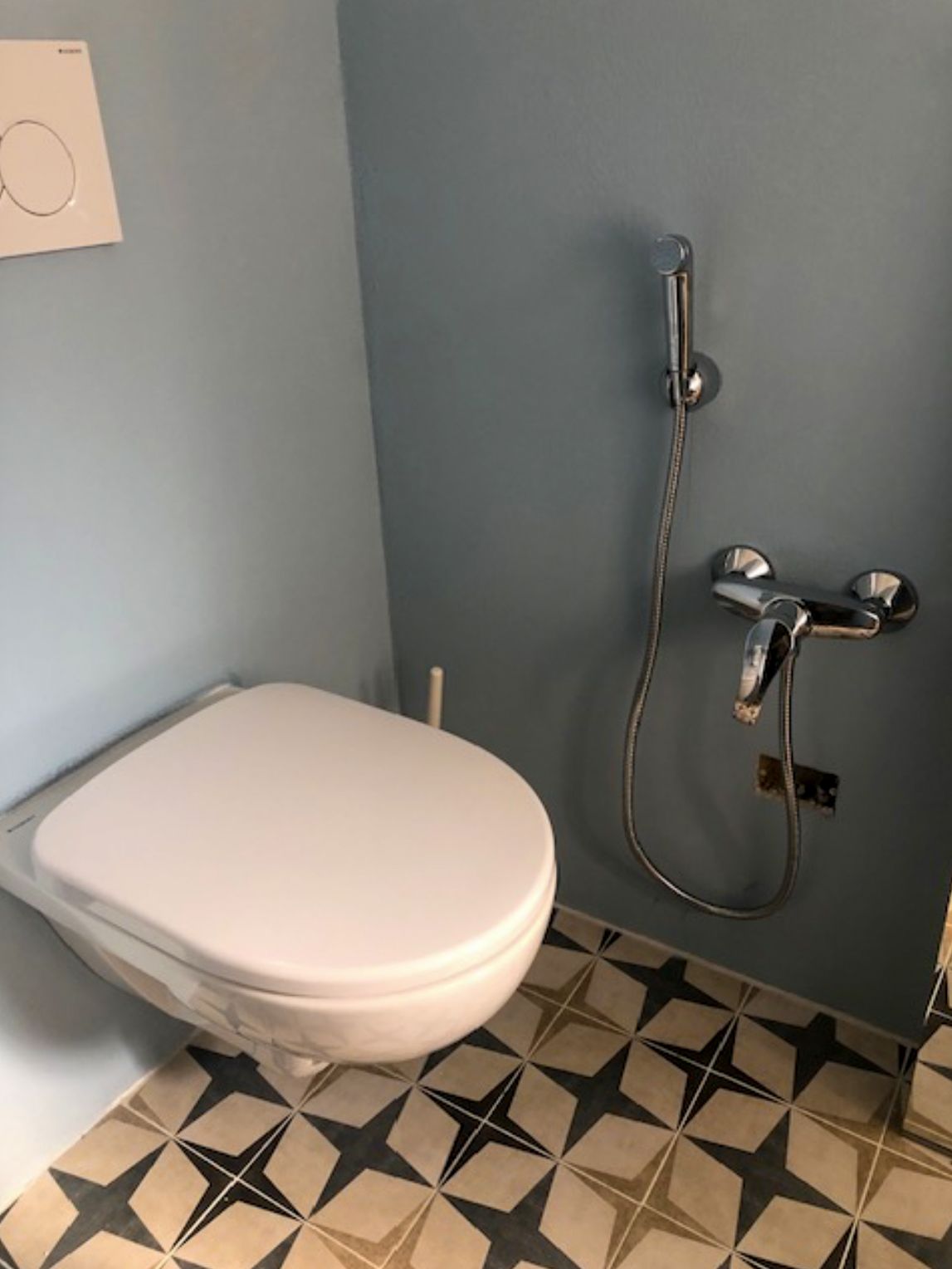 Das Badezimmer ist extern über den Flur über 5 Treppenstufen erreichbar und liegt direkt daneben und ist mit Waschbecken, Dusche und WC.