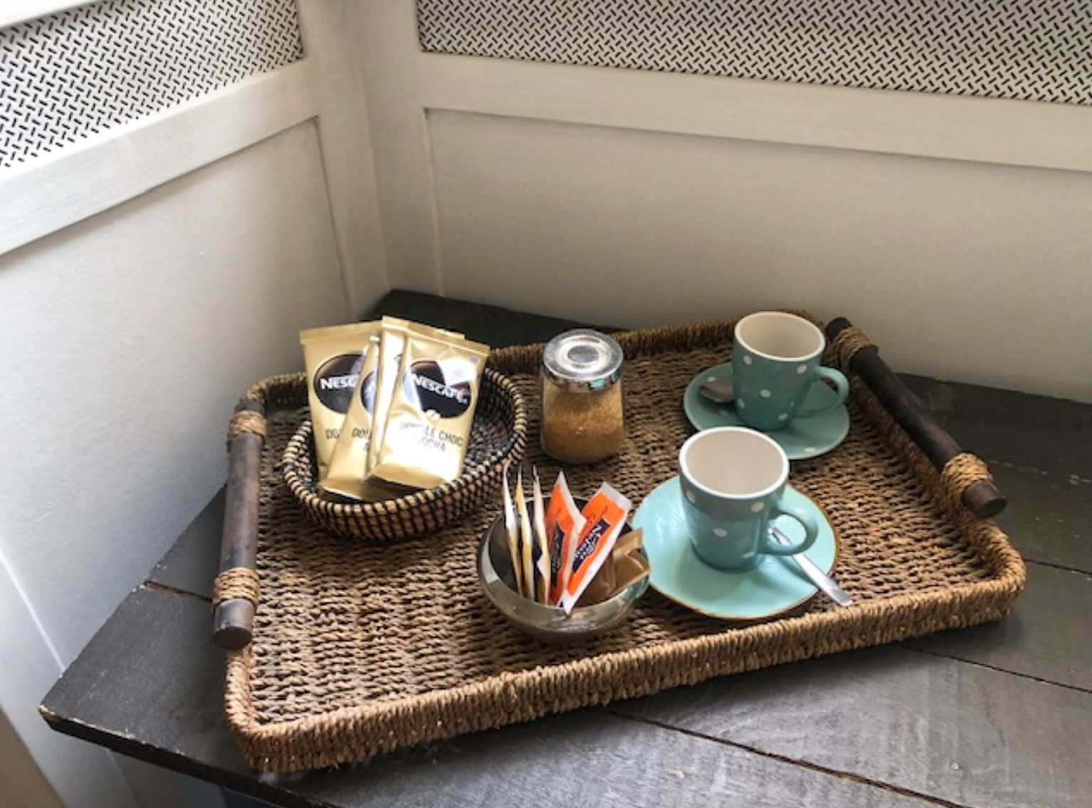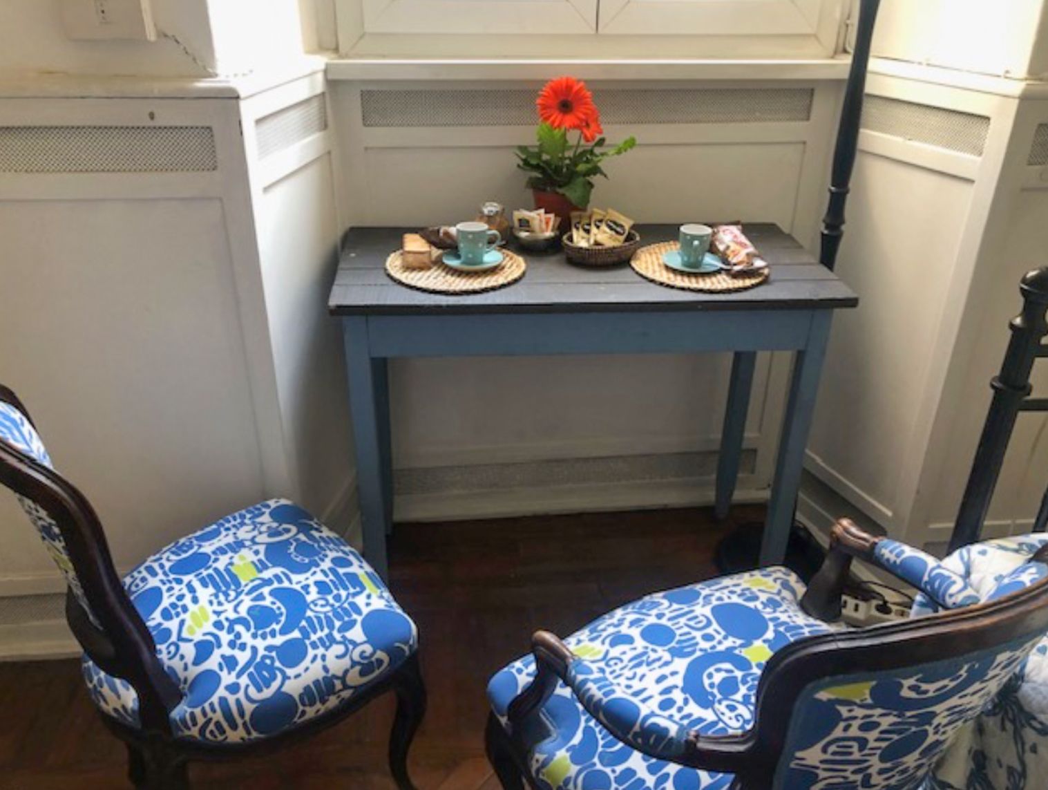 Über das gemeinschaftliche Treppenhaus gelangt man zum Zimmer mit Doppelbett, Kleiderschrank sowie einem kleinen Tisch mit zwei Stühlen und einer kleinen Bar mit Kaffeemaschine und Wasserkocher.
