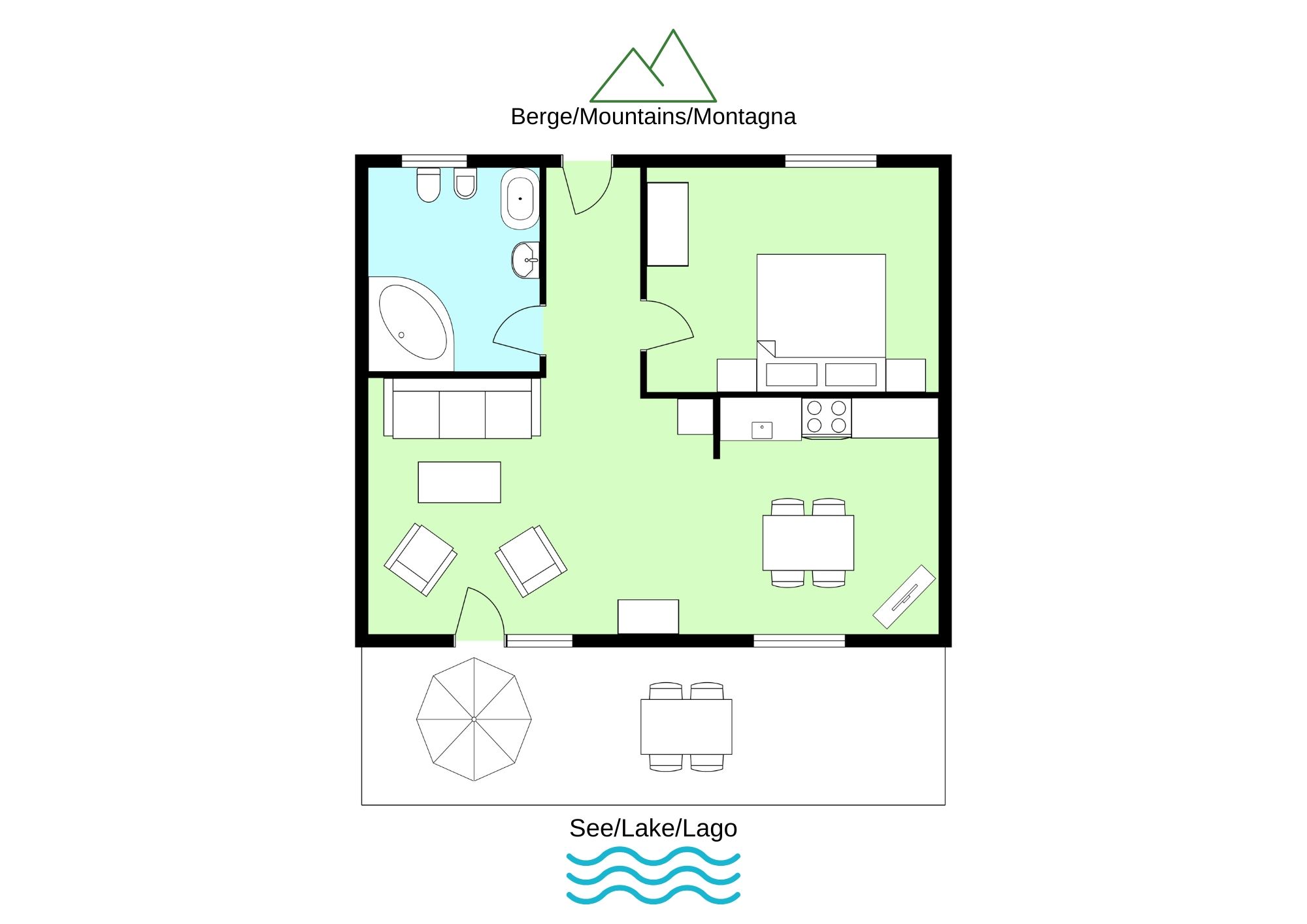 Das Doppelzimmer liegt zur Berg- und Gartenseite. Das Wohlfühlbad ist mit Whirlpoolwanne, Waschtisch und WC/Bidet ausgestattet.