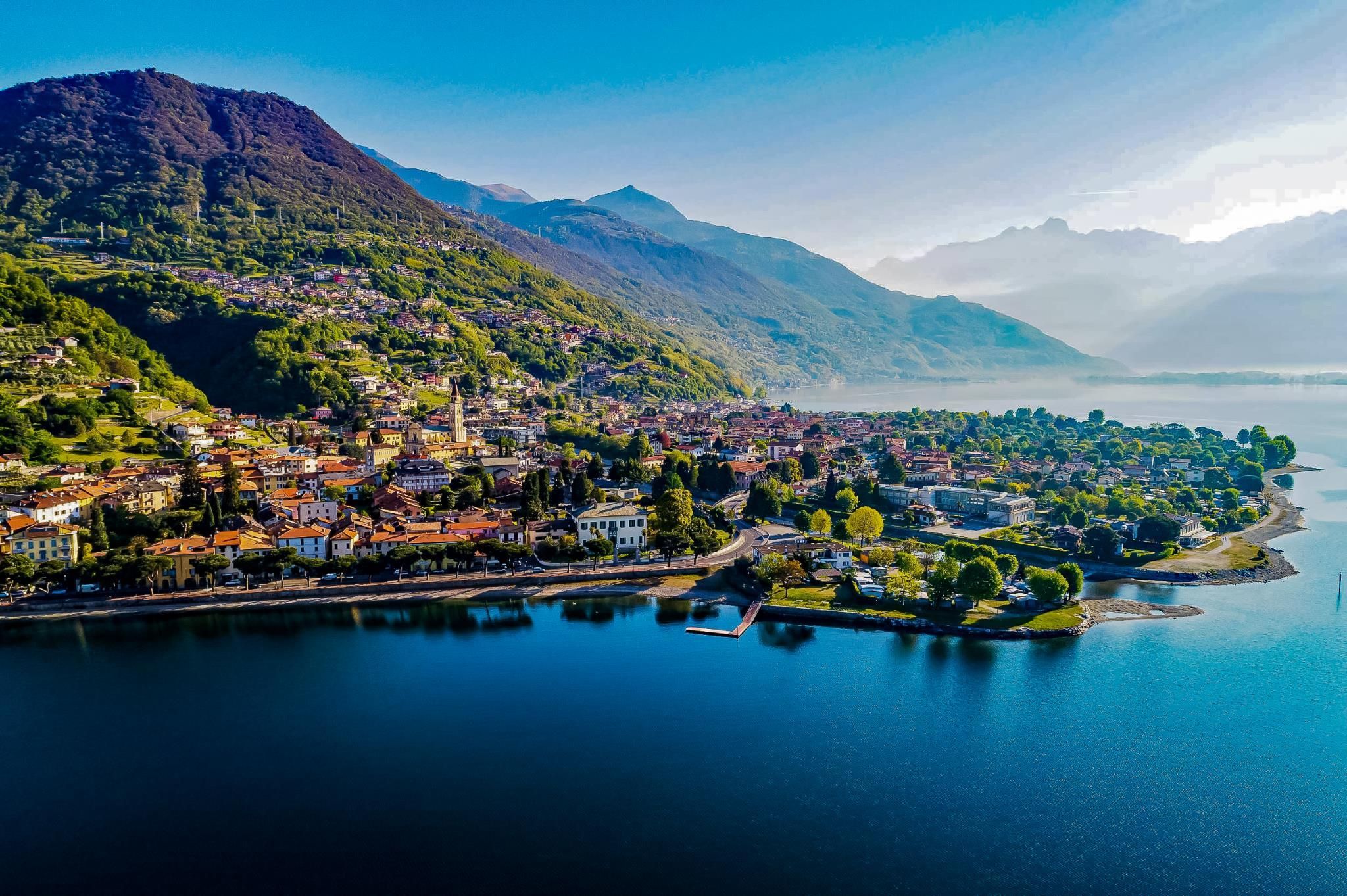 Die Landzunge von Domaso ist unterhalb mit schönen flachen Stränden und Surf-, Kite- und Segelbootverleih.