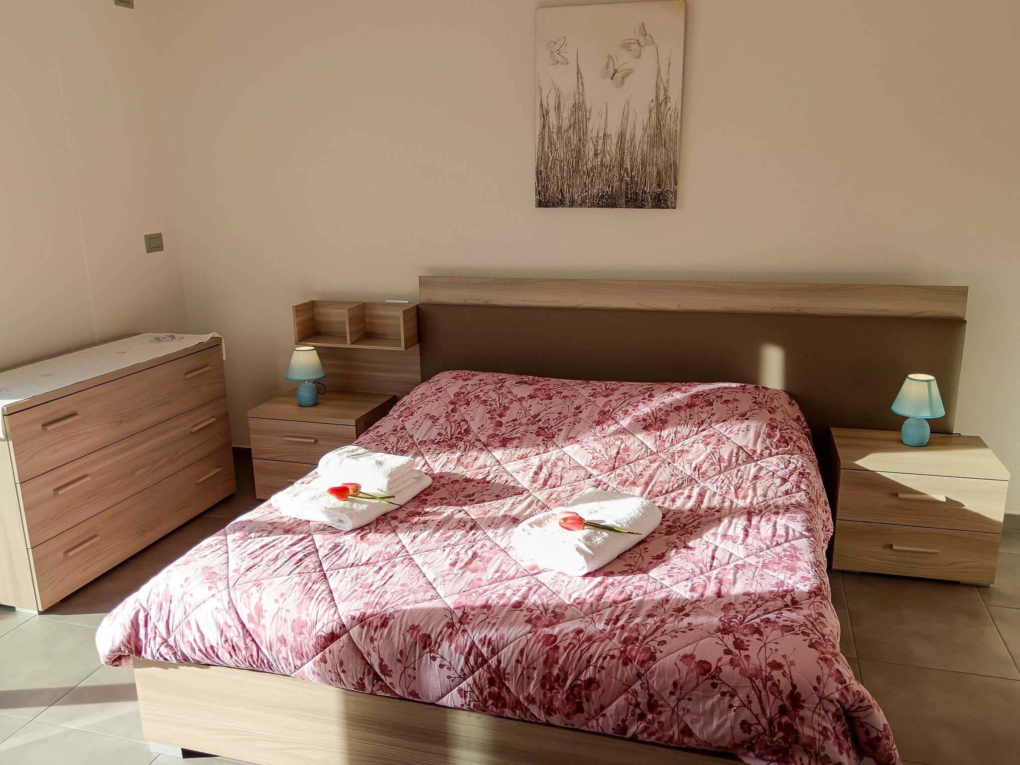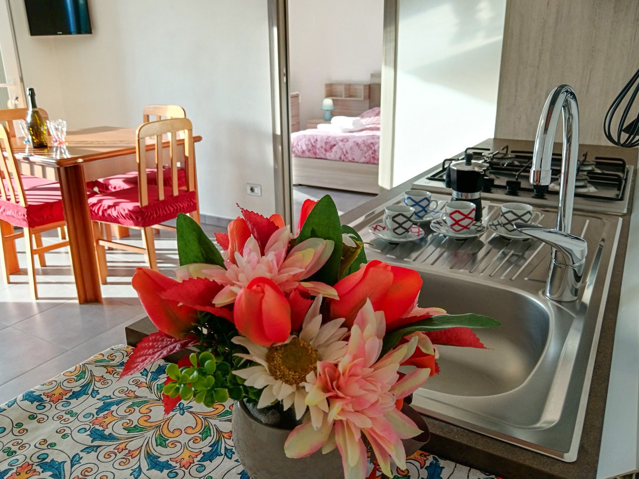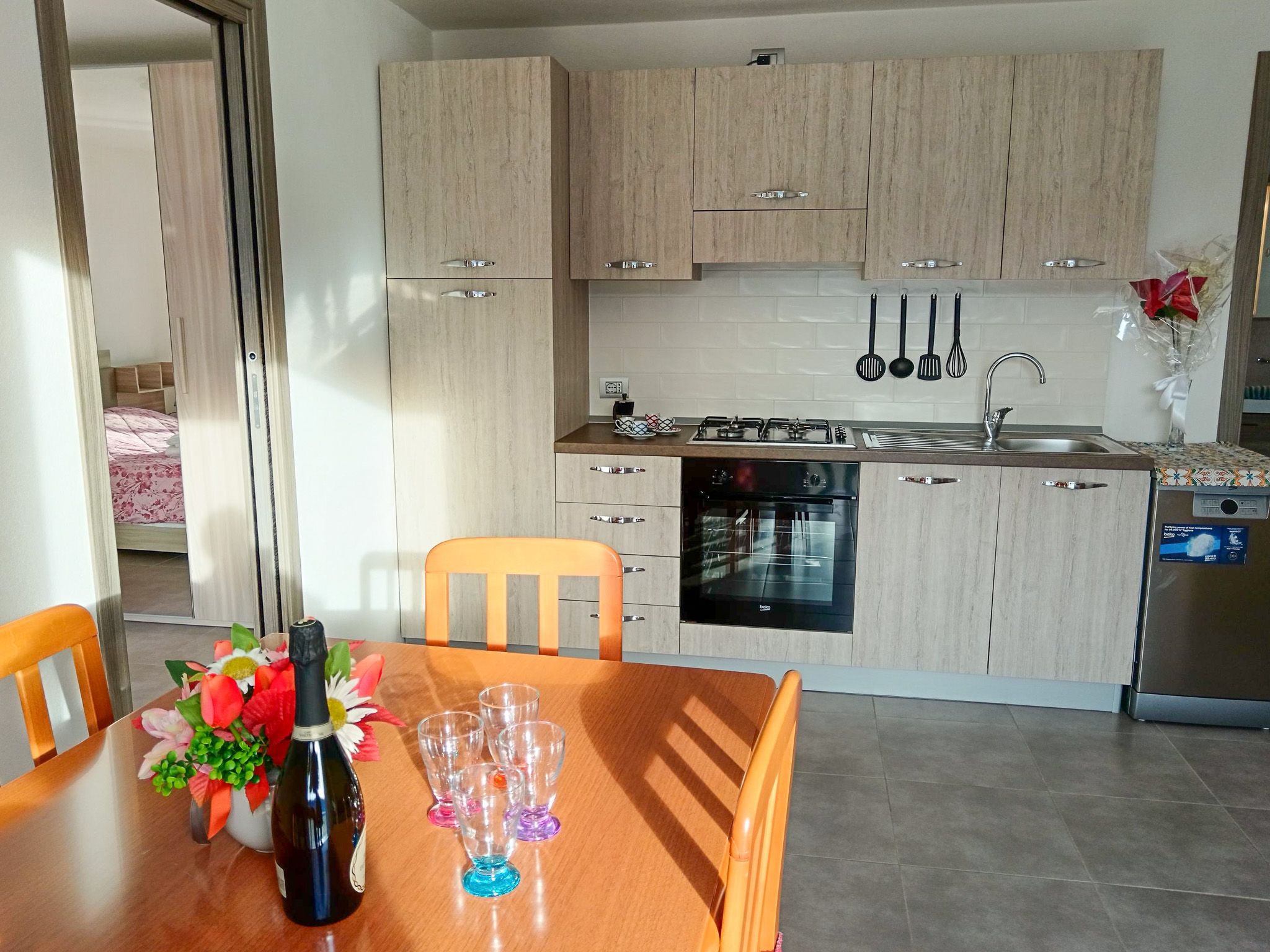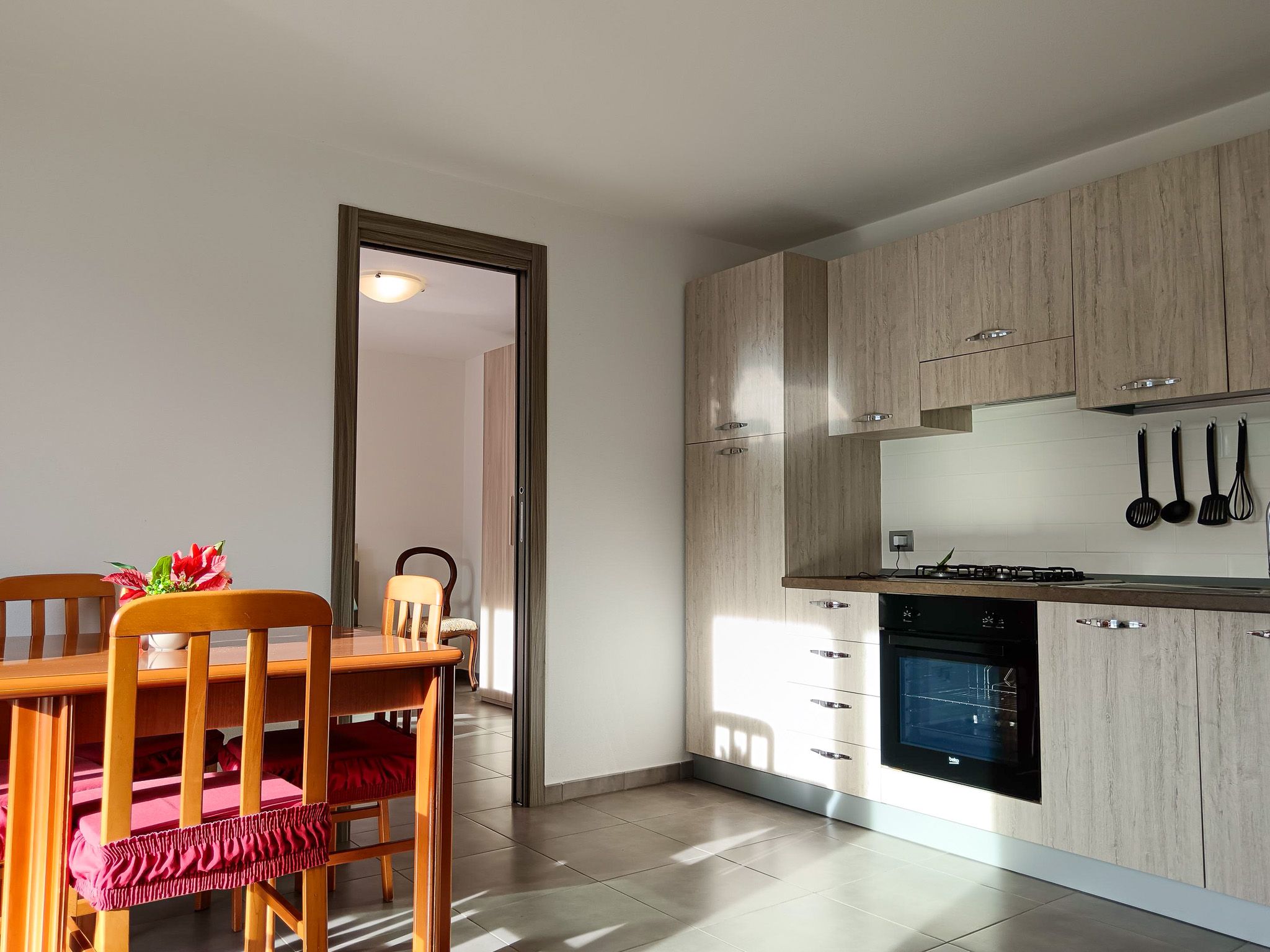 Die Ferienwohnung ist hell, schlicht und modern eingerichtet. Der durchgehend verlegte helle Steinboden unterstreicht das freundliche und zeitlose Ambiente und sorgt auch an warmen Tagen für ein angenehmes Raumklima.