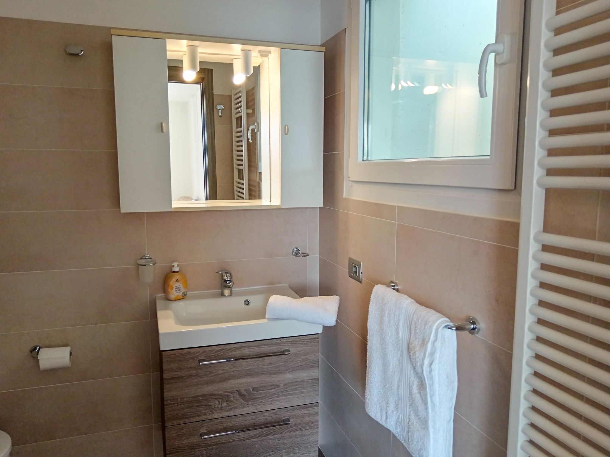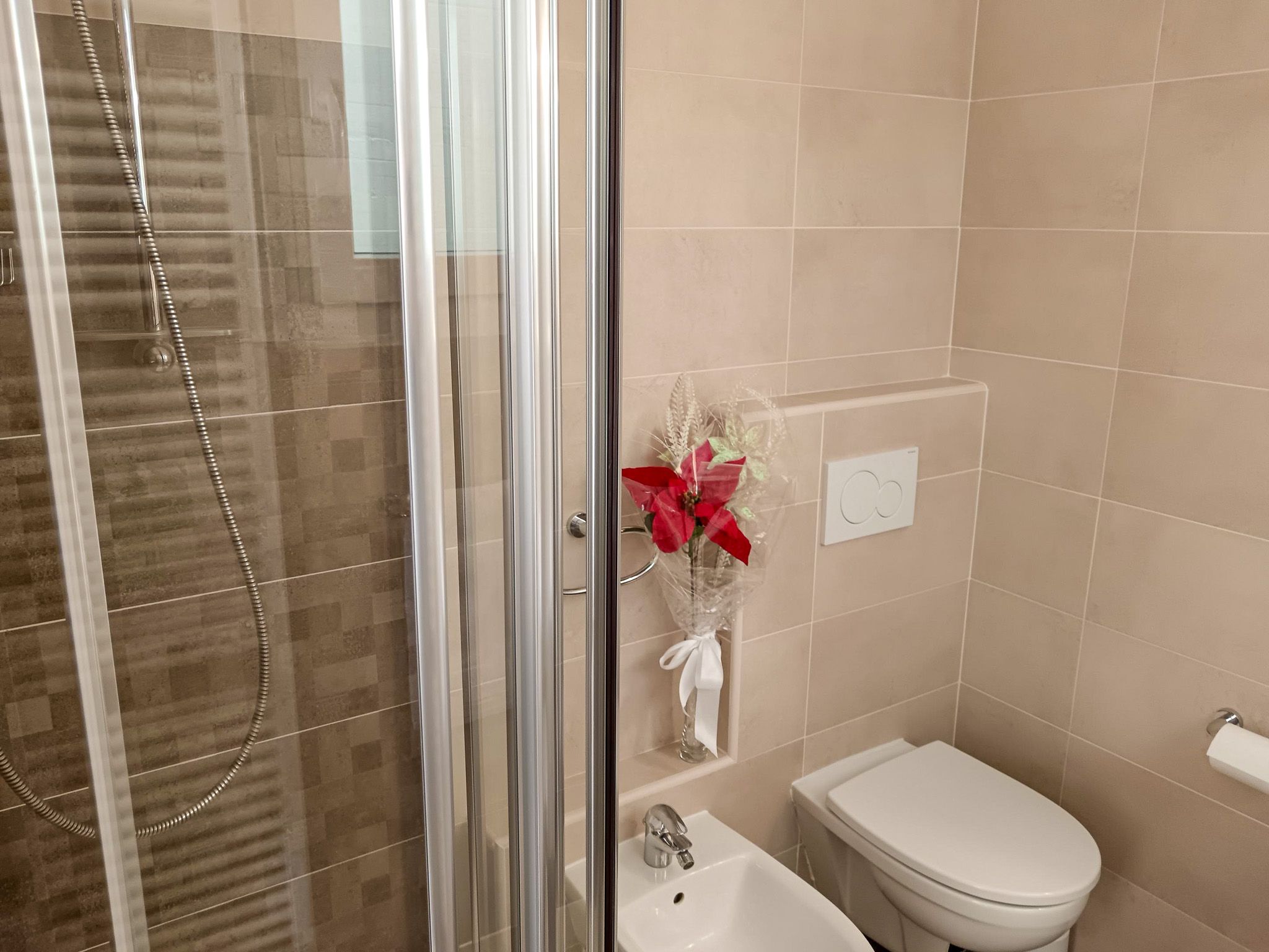 Bergseitig liegt das Badezimmer mit Dusche, Waschbecken, WC und Bidet.