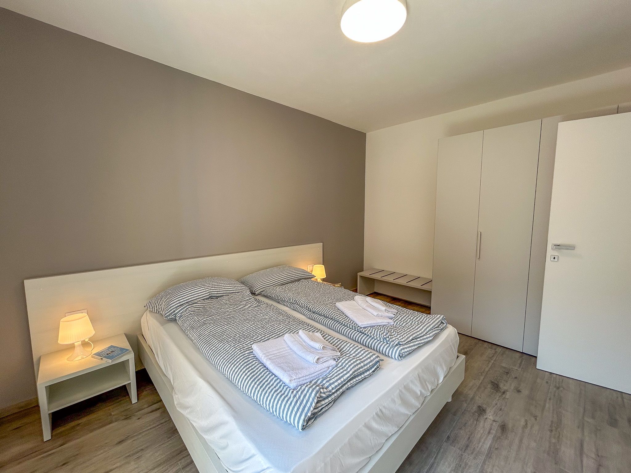 Das geräumige Schlafzimmer mit komfortablem Doppelbett, Kleiderschrank und Nachttischen befindet sich am Ende des Flurs.