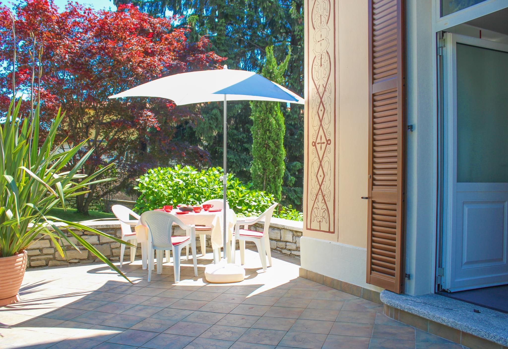 Der Eingang befindet sich auf der Bergseite mit eigener möblierter Gartenterrasse.