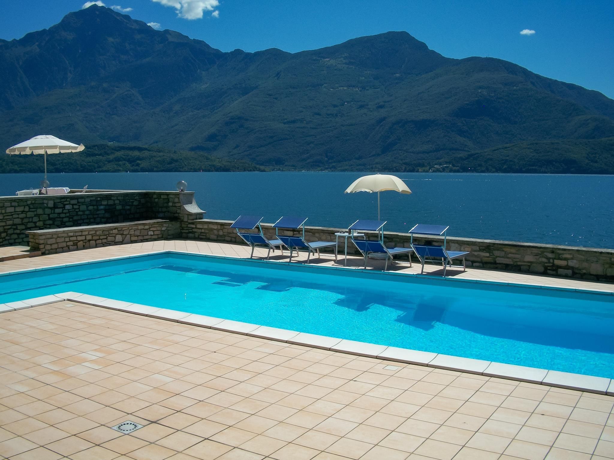 Von der Terrasse mit eleganten Liegestühlen gelangt man über Natursteintreppen und ein abschließbares Tor direkt zum flach abfallenden Kiesstrand.
