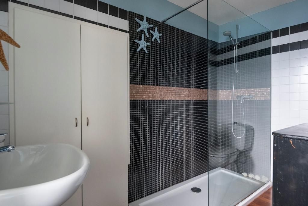 Über eine Treppe gelangen Sie in das Obergeschoss mit einem Zweibettzimmer, das Zugang zu einem Balkon mit herrlichem Panoramablick auf den See bietet, sowie zu einem modernen, hellen Badezimmer mit großer Dusche.