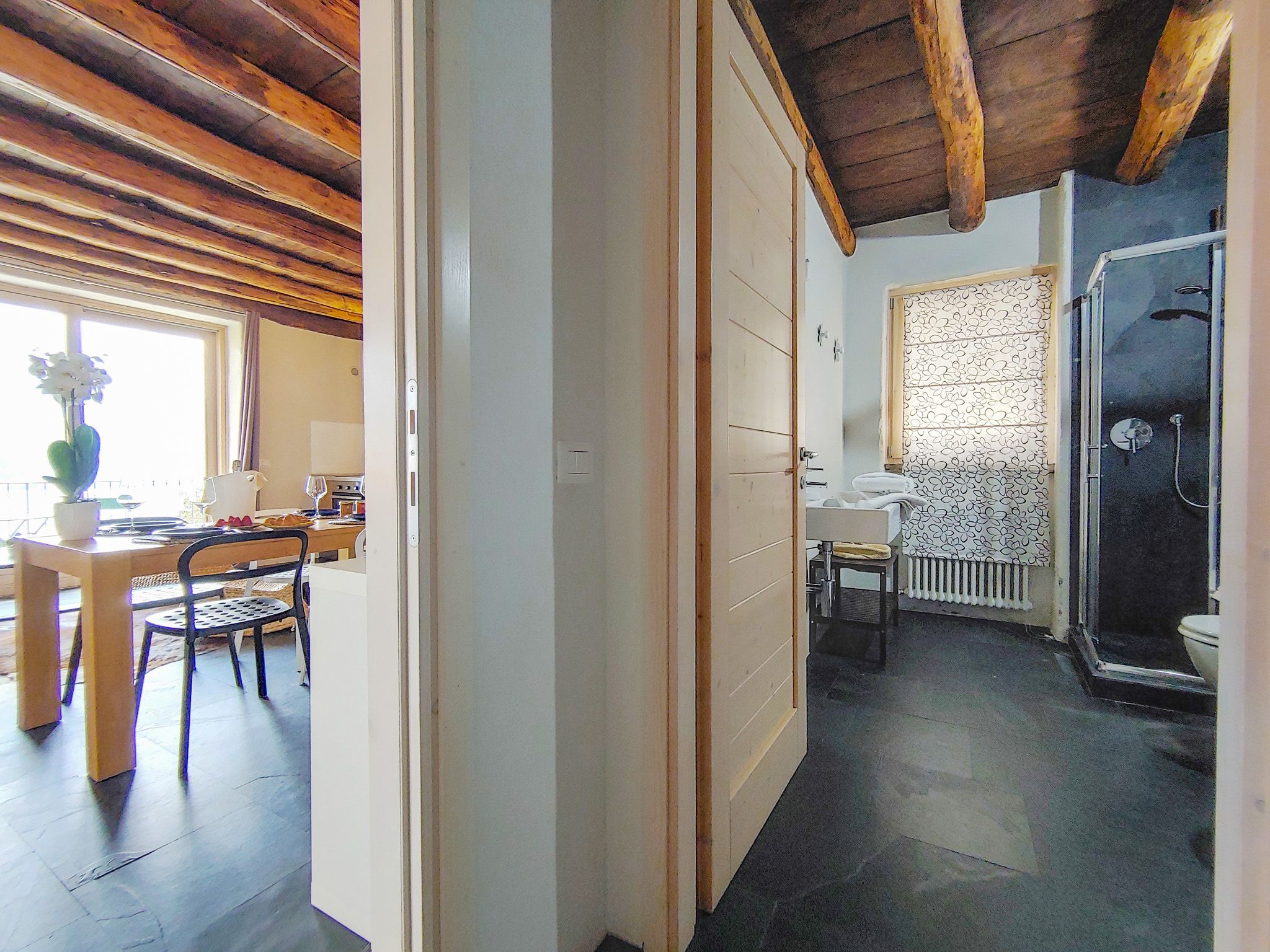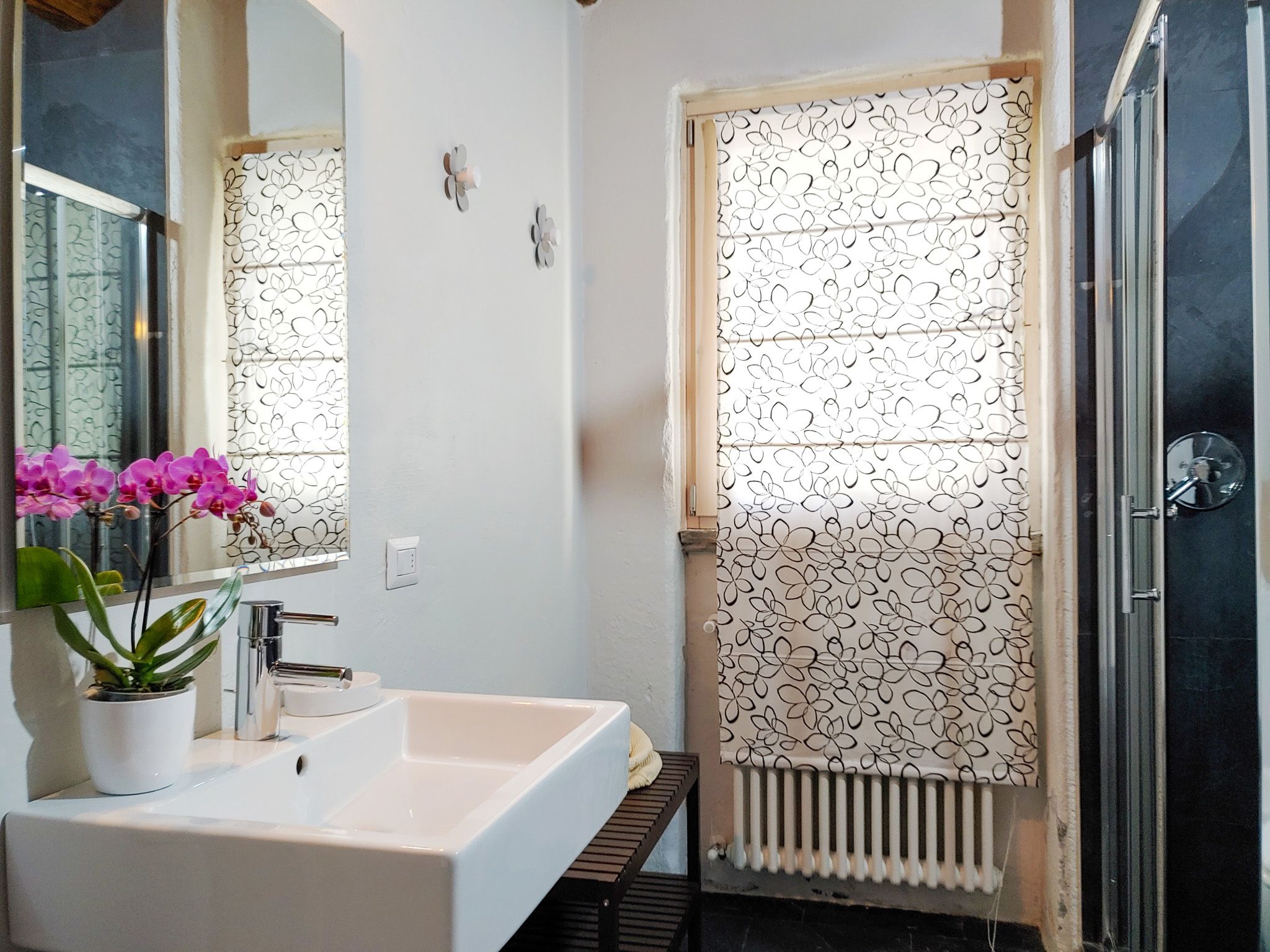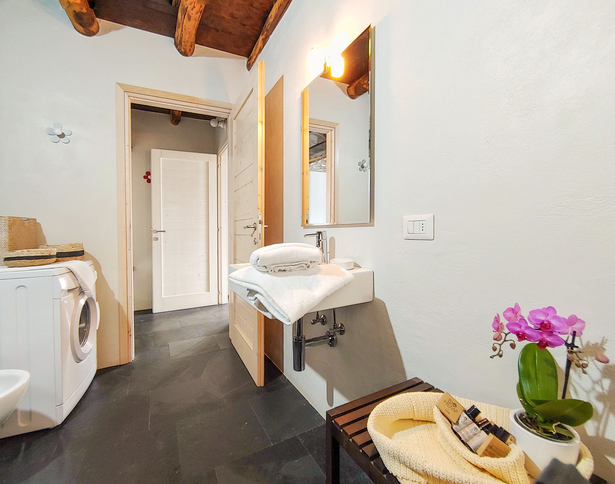 Auf der Bergseite befindet sich das Badezimmer, das mit einem Waschtisch, WC, Bidet, Dusche und einer Waschmaschine ausgestattet ist.