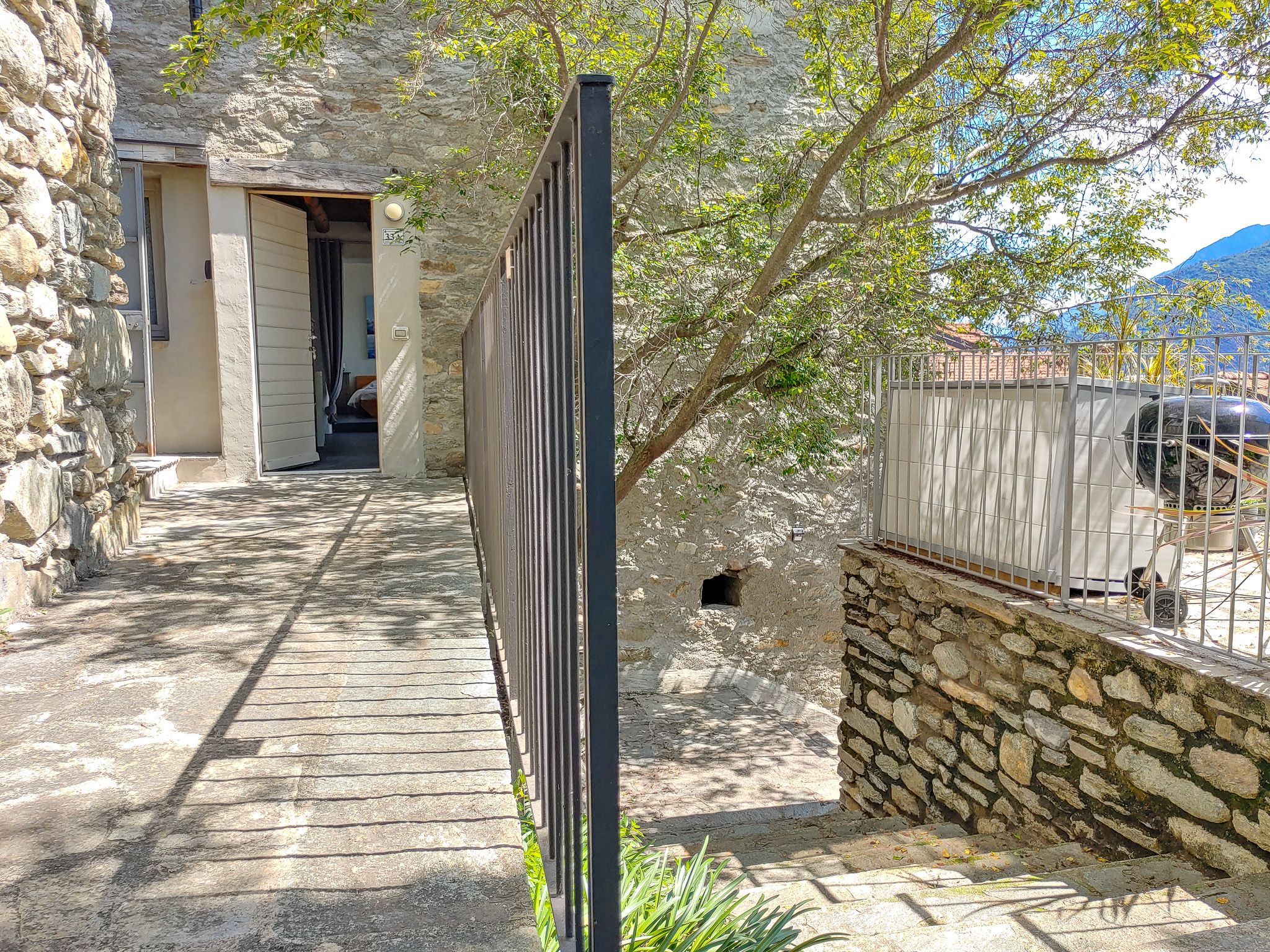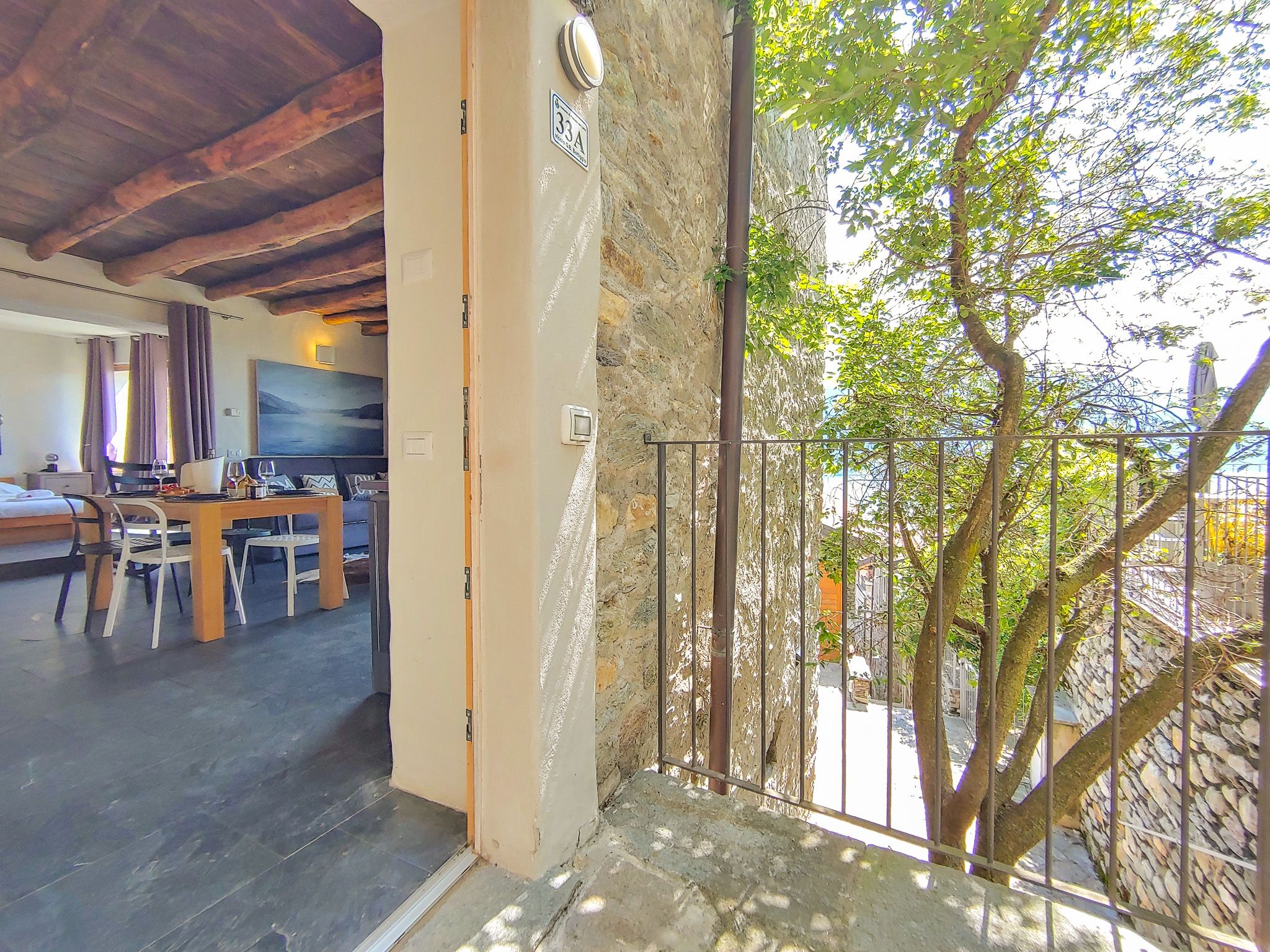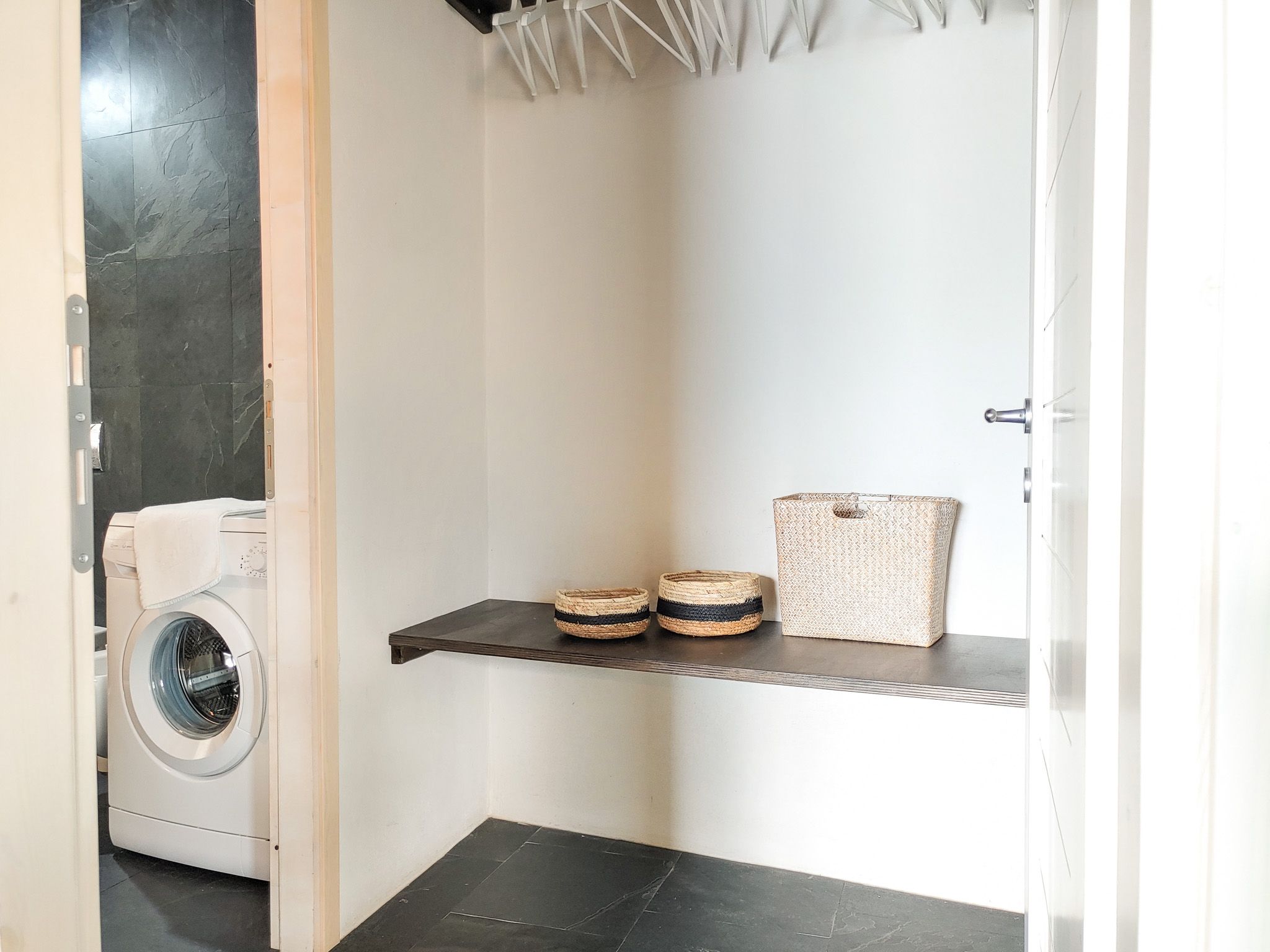 Auf der Bergseite befindet sich das Badezimmer, das mit einem Waschtisch, WC, Bidet, Dusche und einer Waschmaschine ausgestattet ist.