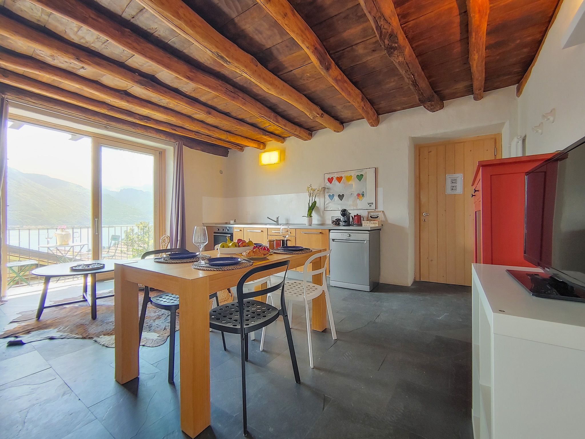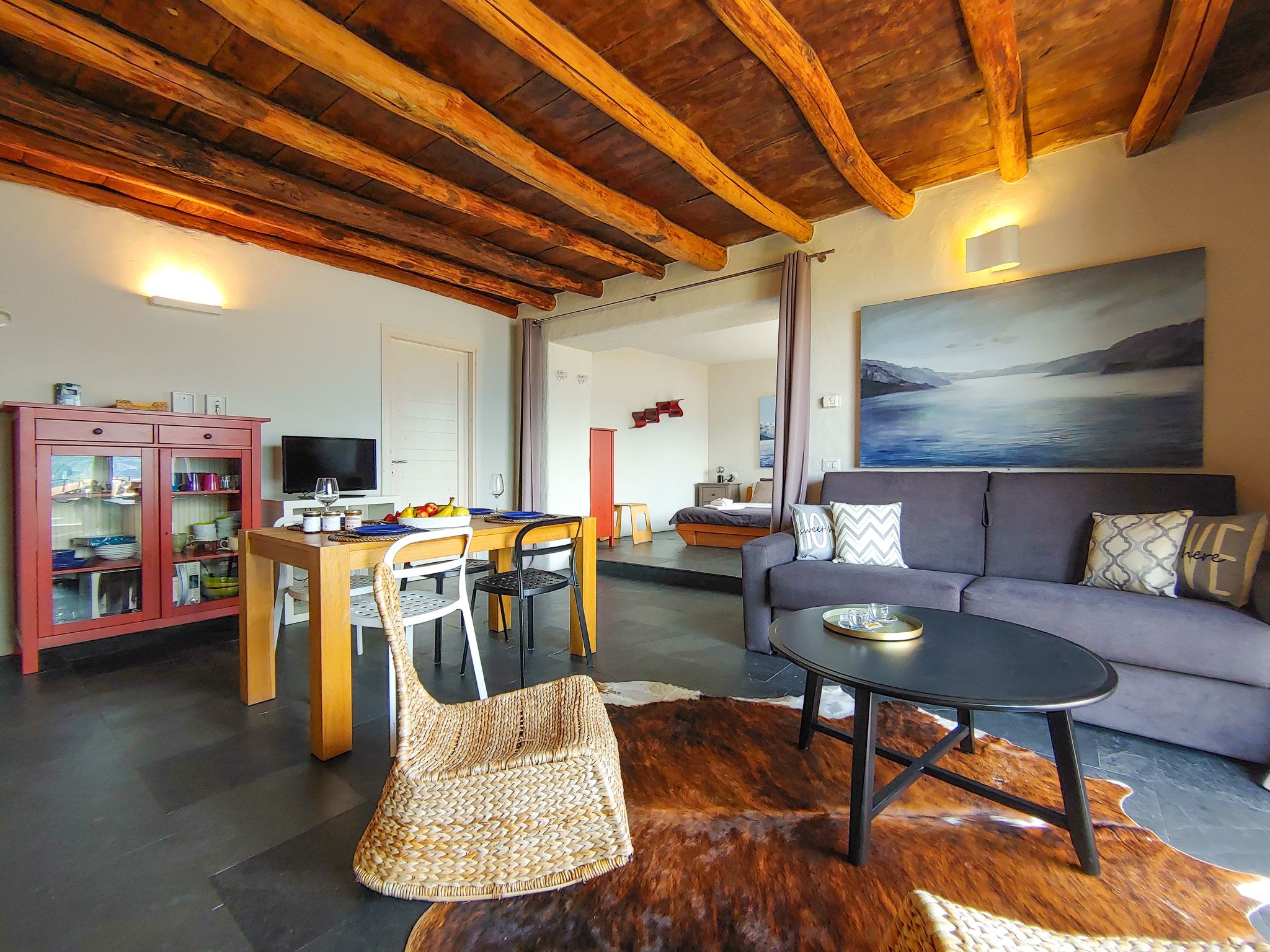 Die Wohnung begeistert durch große Panoramafenster zum See, hochwertige Steinböden und gemütliche Decken mit Holzbalken, die eine warme und einladende Atmosphäre schaffen.