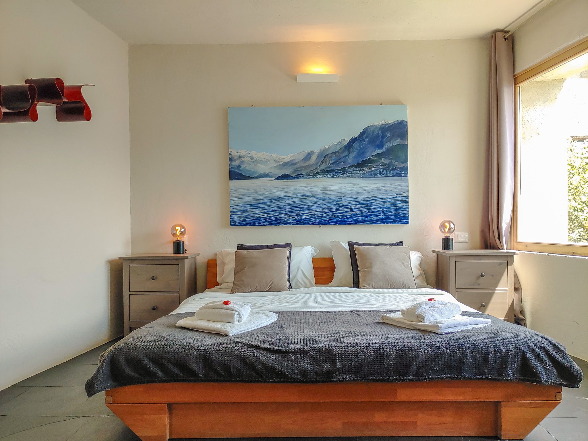 Eine Stufe verbindet den Wohnbereich mit dem Schlafzimmer, das ein gemütliches Doppelbett und eine große Fensterfront mit Seeblick bietet. Bei Bedarf kann das Schlafzimmer mit einem blickdichten Vorhang vom Wohnbereich abgetrennt werden.