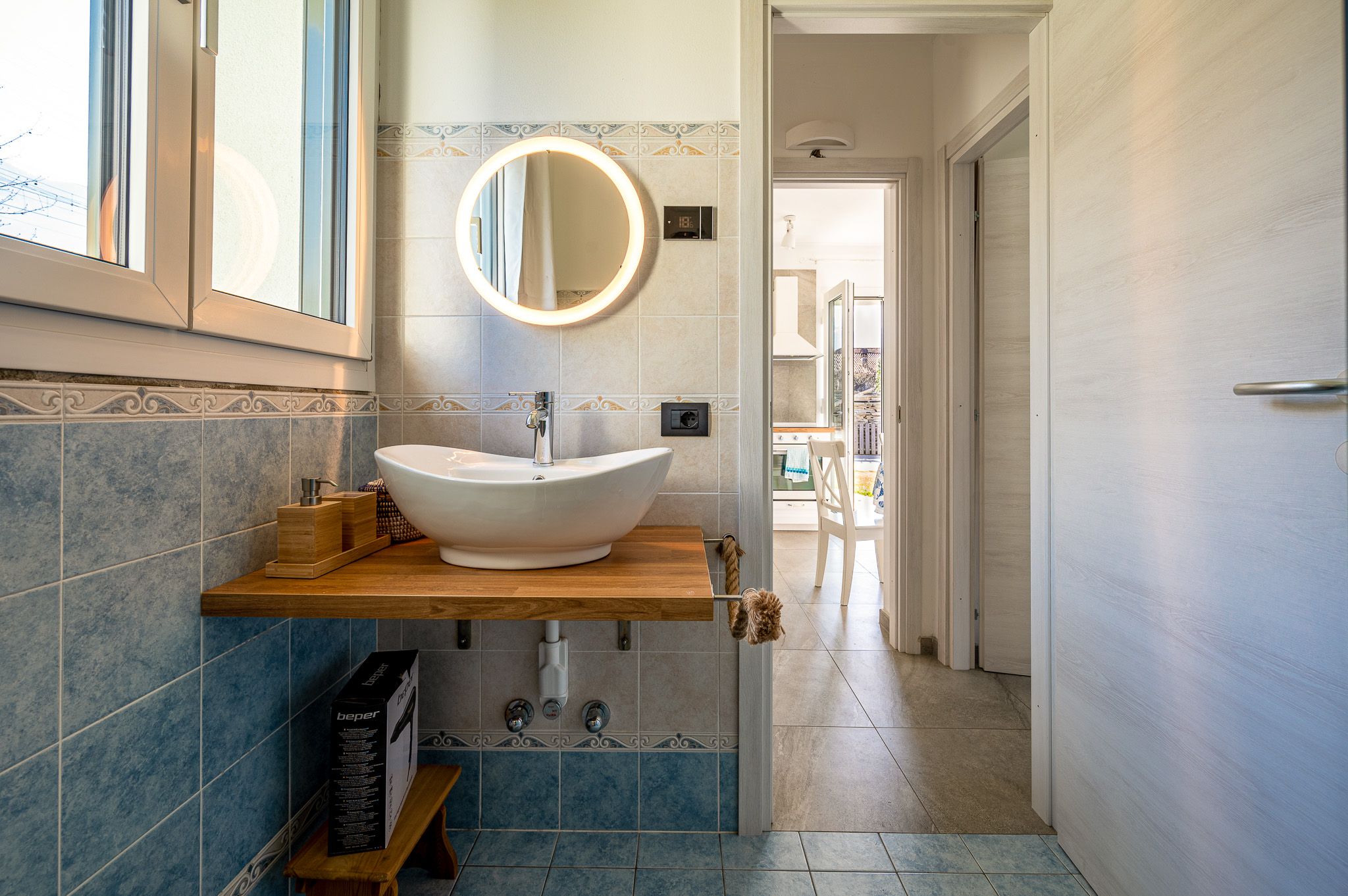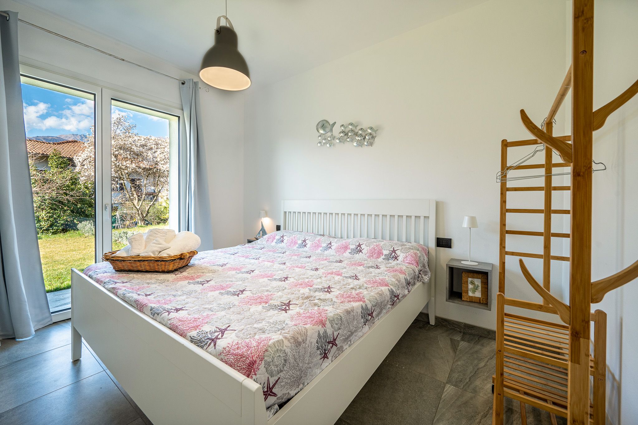 Über einen kleinen Flur gelangt man in das Schlafzimmer mit Doppelbett sowie, das helle und moderne Bad mit Dusche, Waschbecken und WC/Bidet.