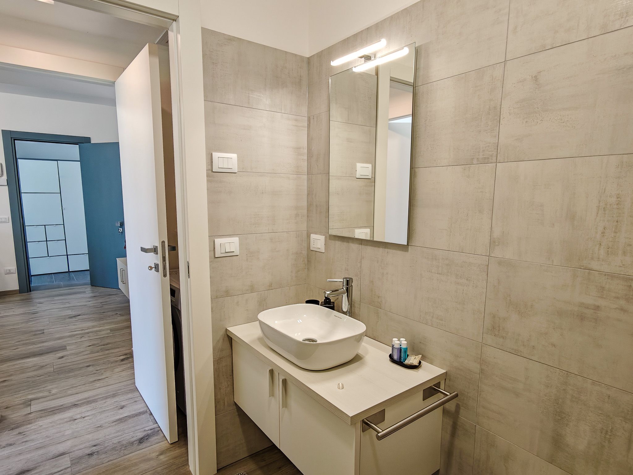 Vom offenen Wohnbereich führt ein Flur in das moderne Badezimmer, das mit Dusche, Waschtisch, WC und Bidet, Handtuchheitzer, so wie einem Fenster, ausgestattet ist. Helle Farben und der Fußboden in Holzoptik sorgen für eine behagliche Atmosphäre.