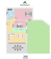 Über den Treppenaufgang kommen Sie zum Wohnungseingang, der in einen kleinen Flur führt. Zur Seeseite geht man in den großen, hellen Wohnbereich mit angrenzender, gut ausgestatteter Küche sowie Essplatz. Vom Wohnbereich haben Sie Zugang auf die große, überdachte Terrasse und den Garten.