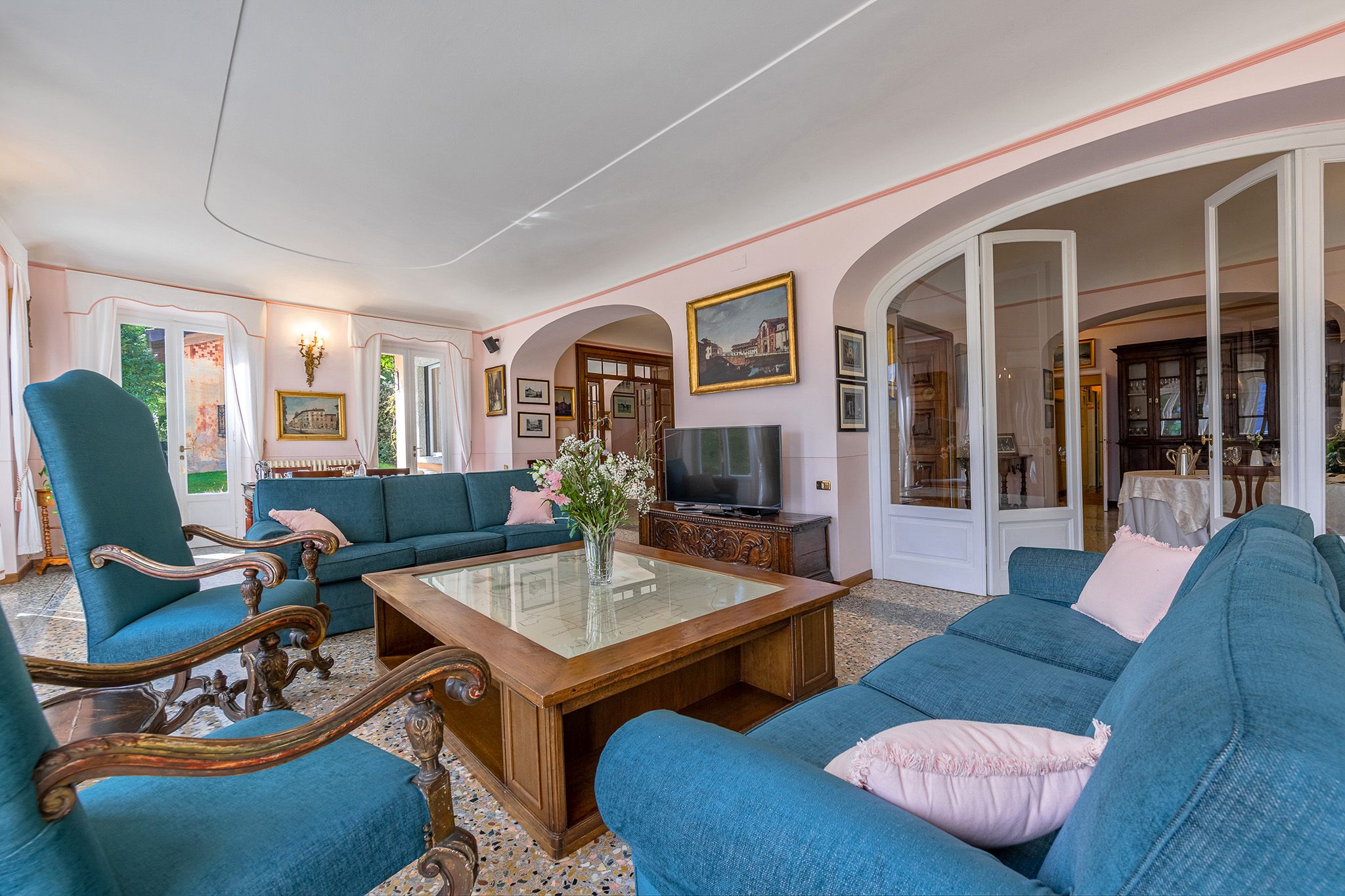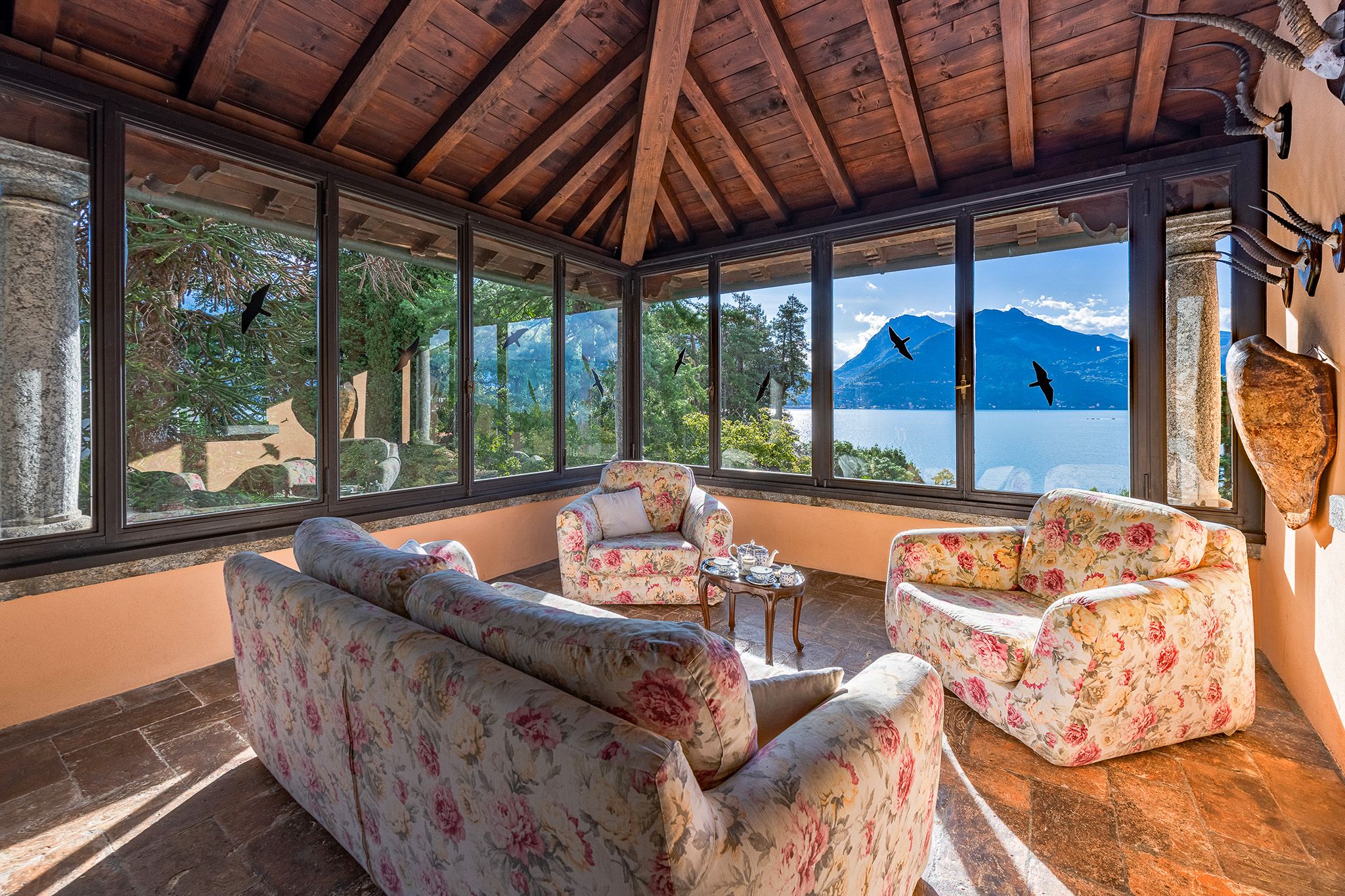 - gemütliches, lichtdurchflutetes Wohnzimmer mit offenem Kamin und Türen, die auf einen großen Rasen mit Blick auf den Comer See führen