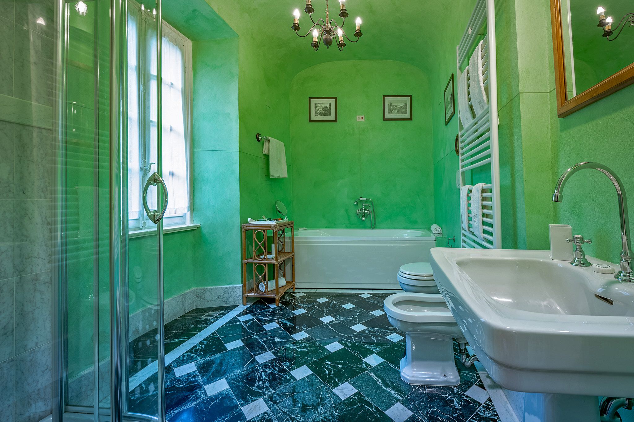 - 1 Doppelschlafzimmer (grün) mit Gartenblick; en Suite Badezimmer mit Badewanne und separater Dusche.