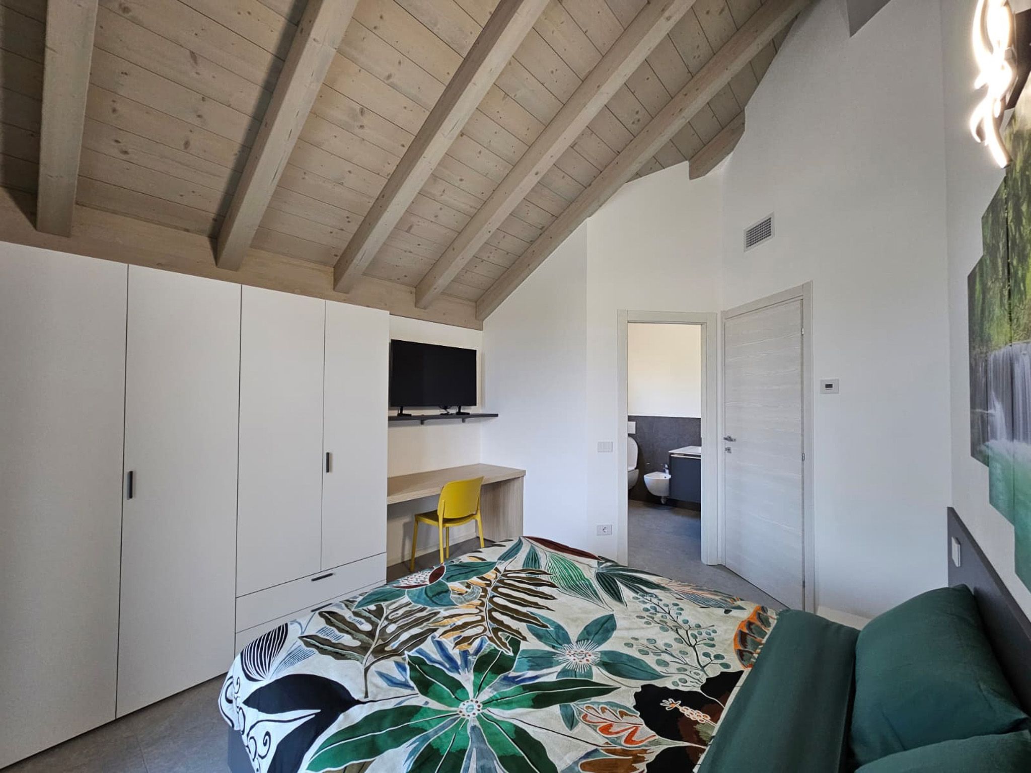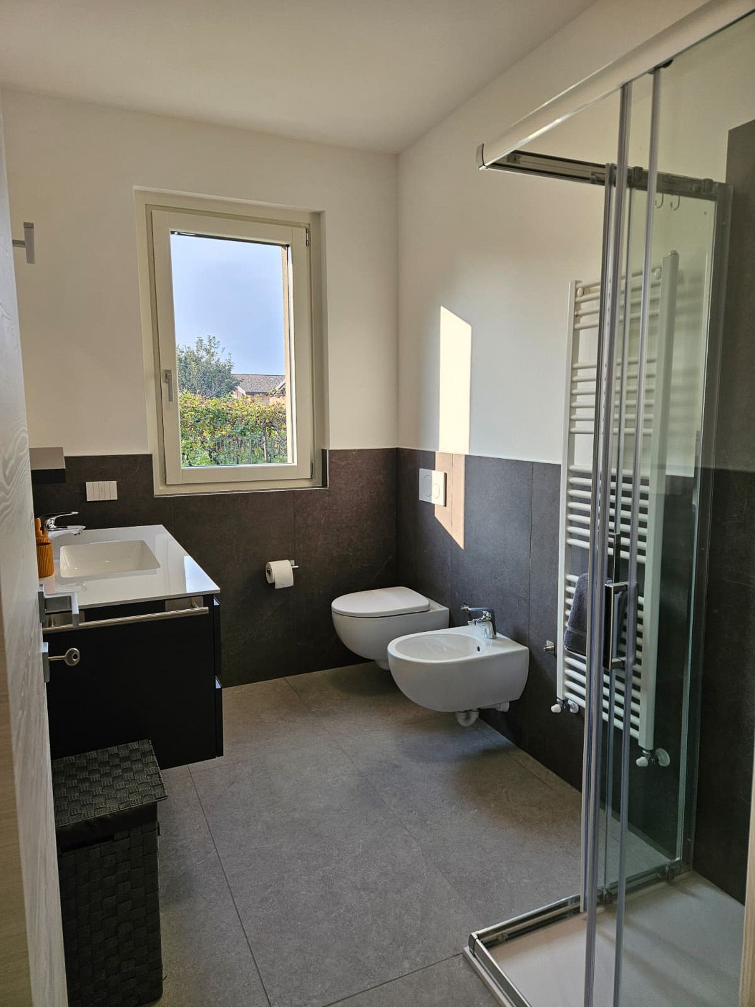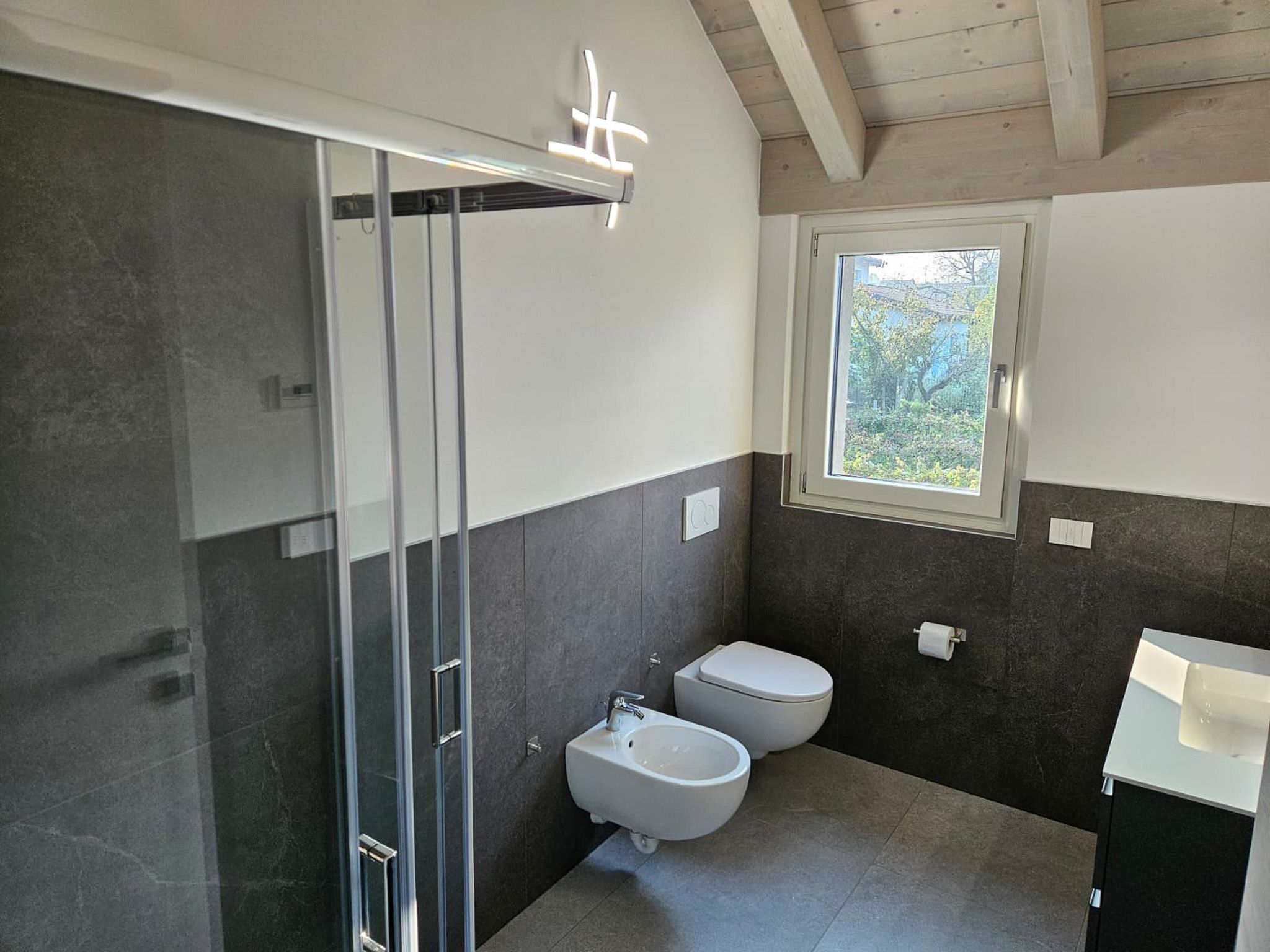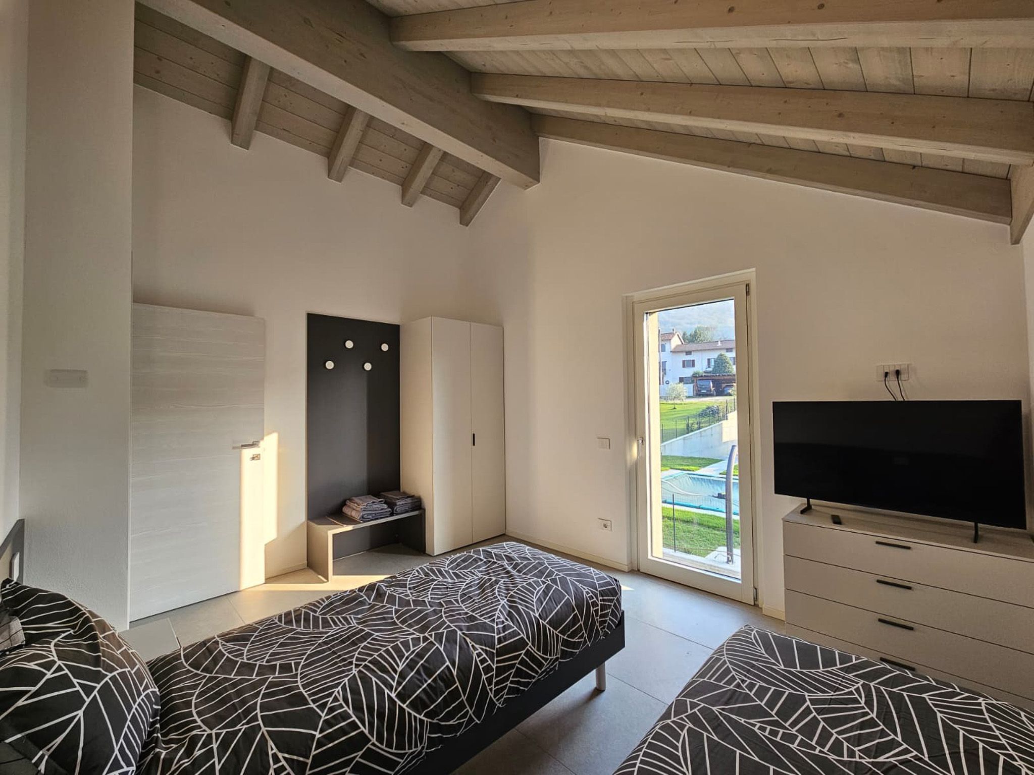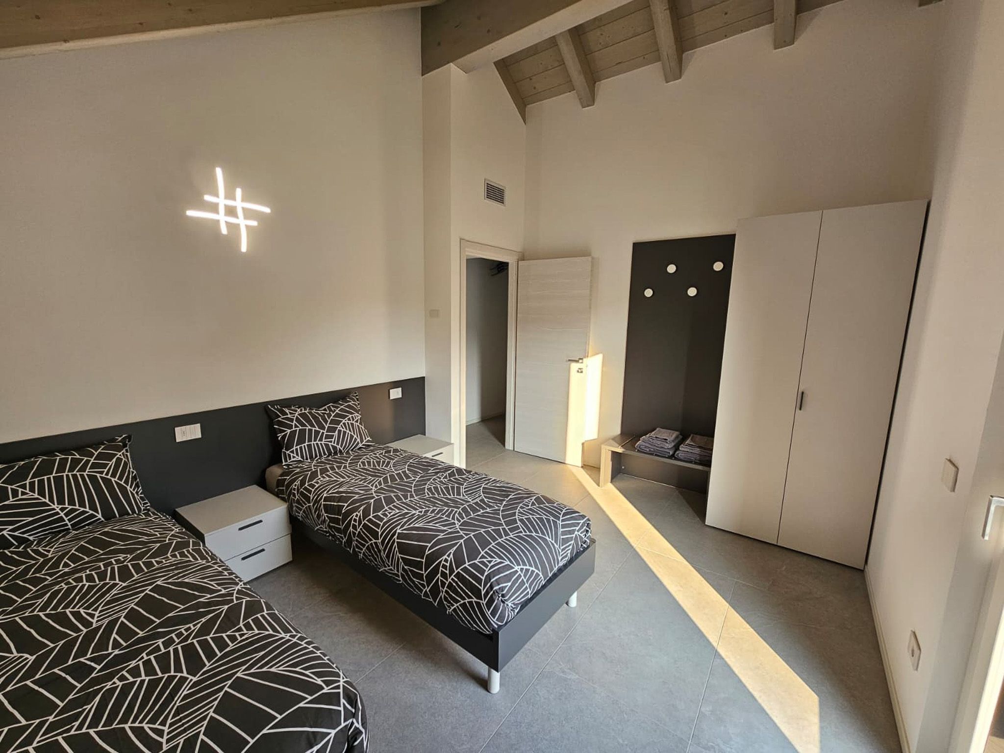 Auf der Bergseite befindet sich ein Zweibettzimmer mit zwei Einzelbetten sowie ein weiteres Badezimmer mit Waschbecken, Dusche, WC und Bidet.