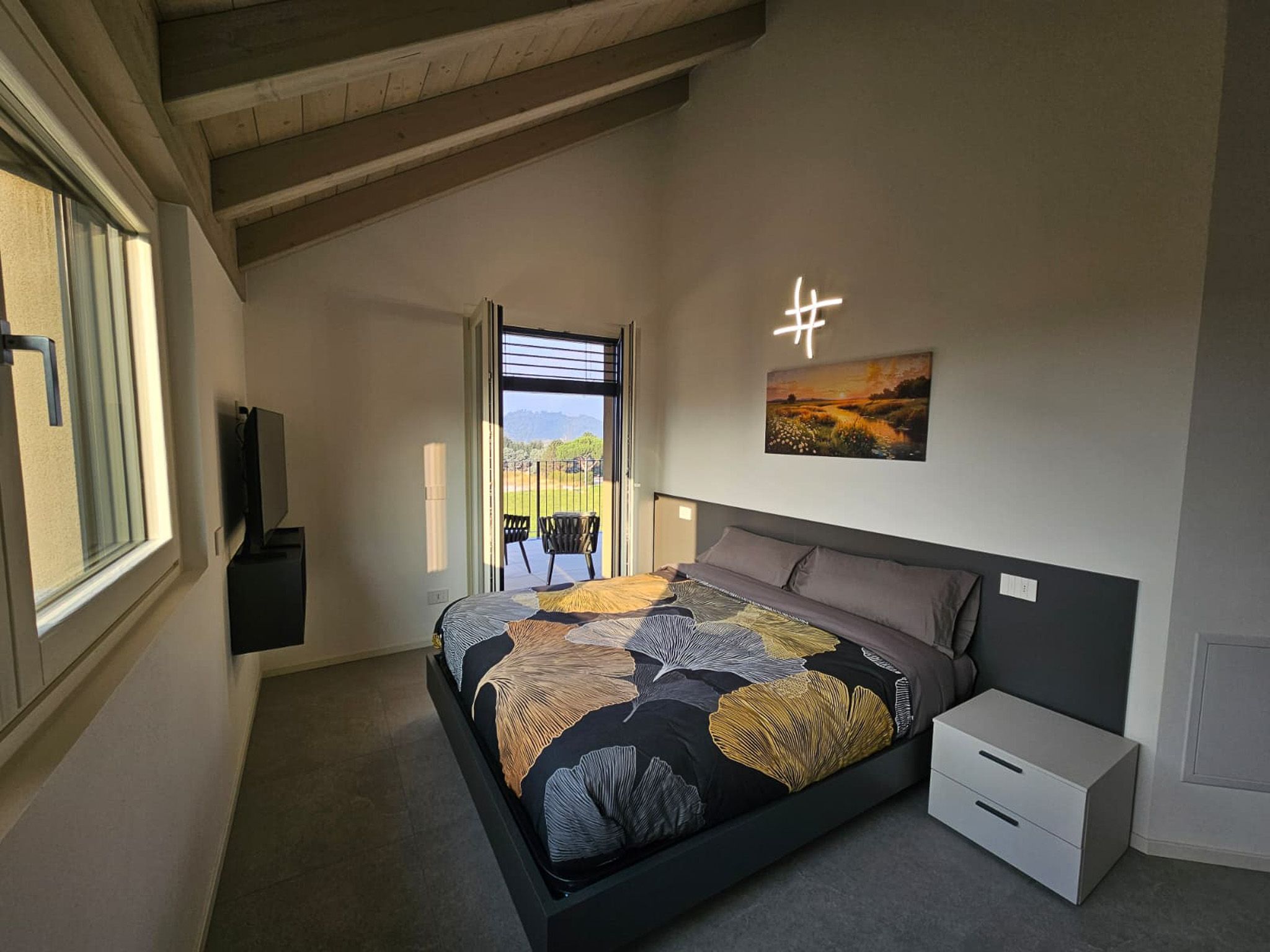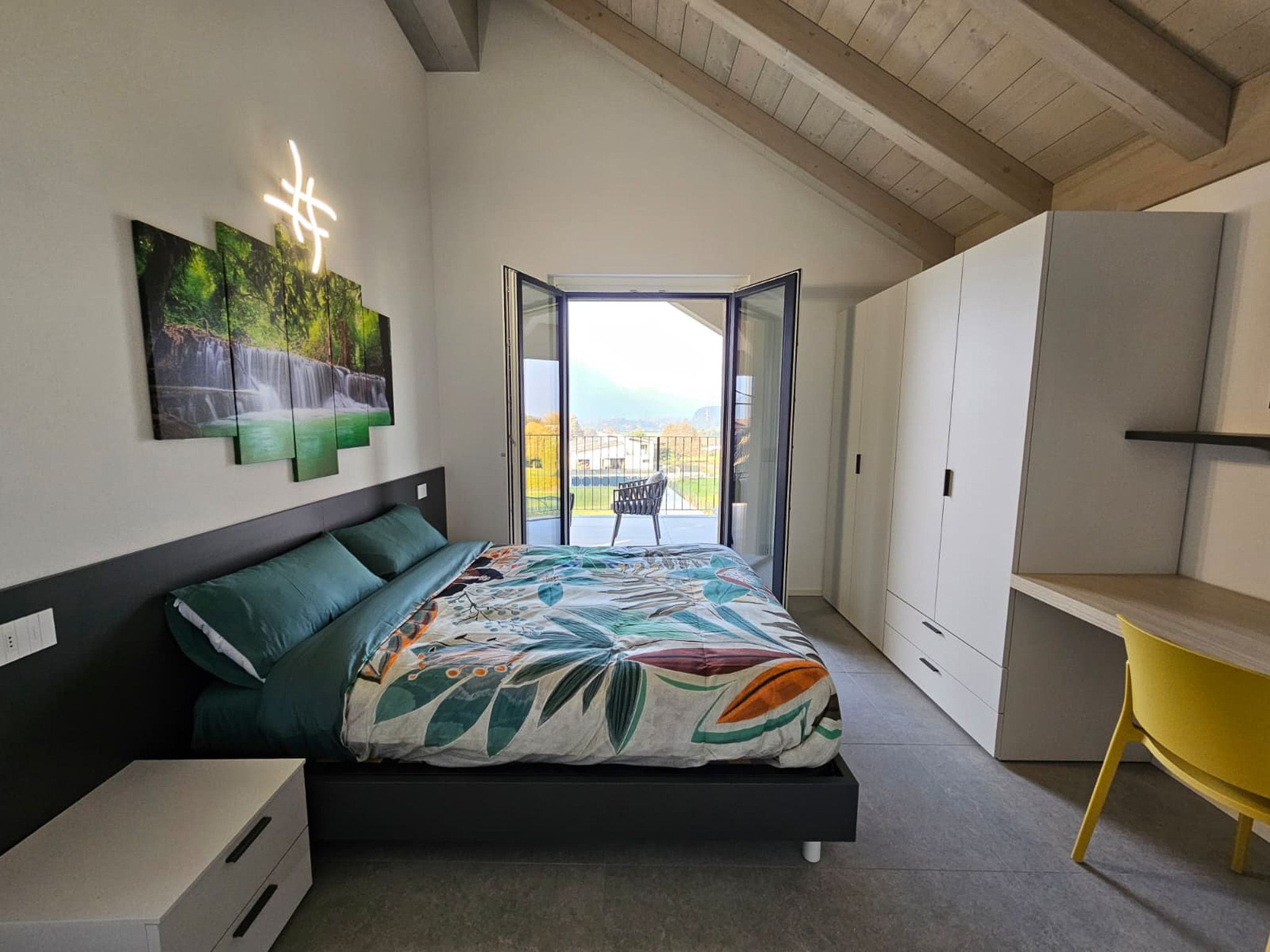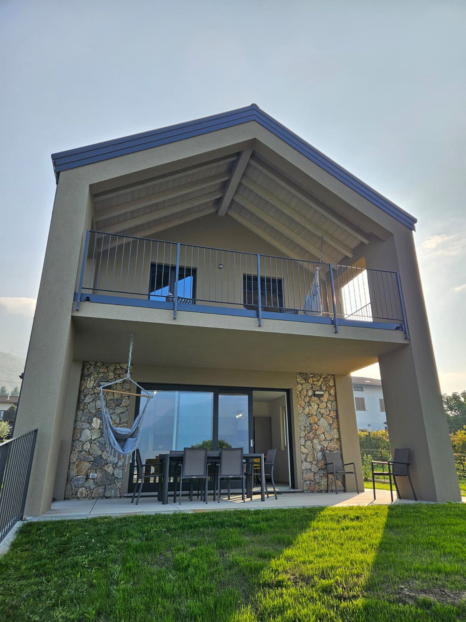 Über eine Treppe gelangen Sie ins Obergeschoss. Auf der Seeseite liegt das Hauptschlafzimmer mit Doppelbett und Bad en Suite, ausgestattet mit Waschbecken, Dusche, WC und Bidet. Ebenfalls auf dieser Seite befindet sich ein weiteres Schlafzimmer mit Doppelbett. Beide Zimmer haben Zugang zu einem großzügigen Balkon mit gemütlichen Loungestühlen.