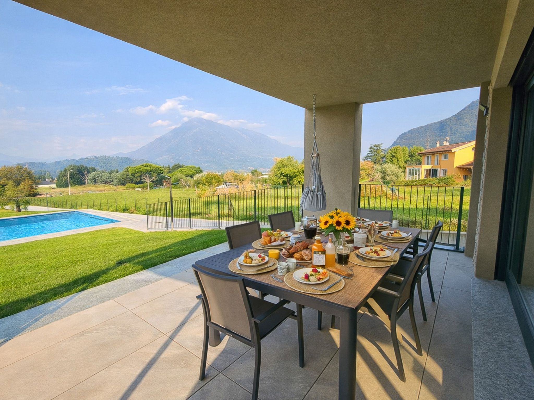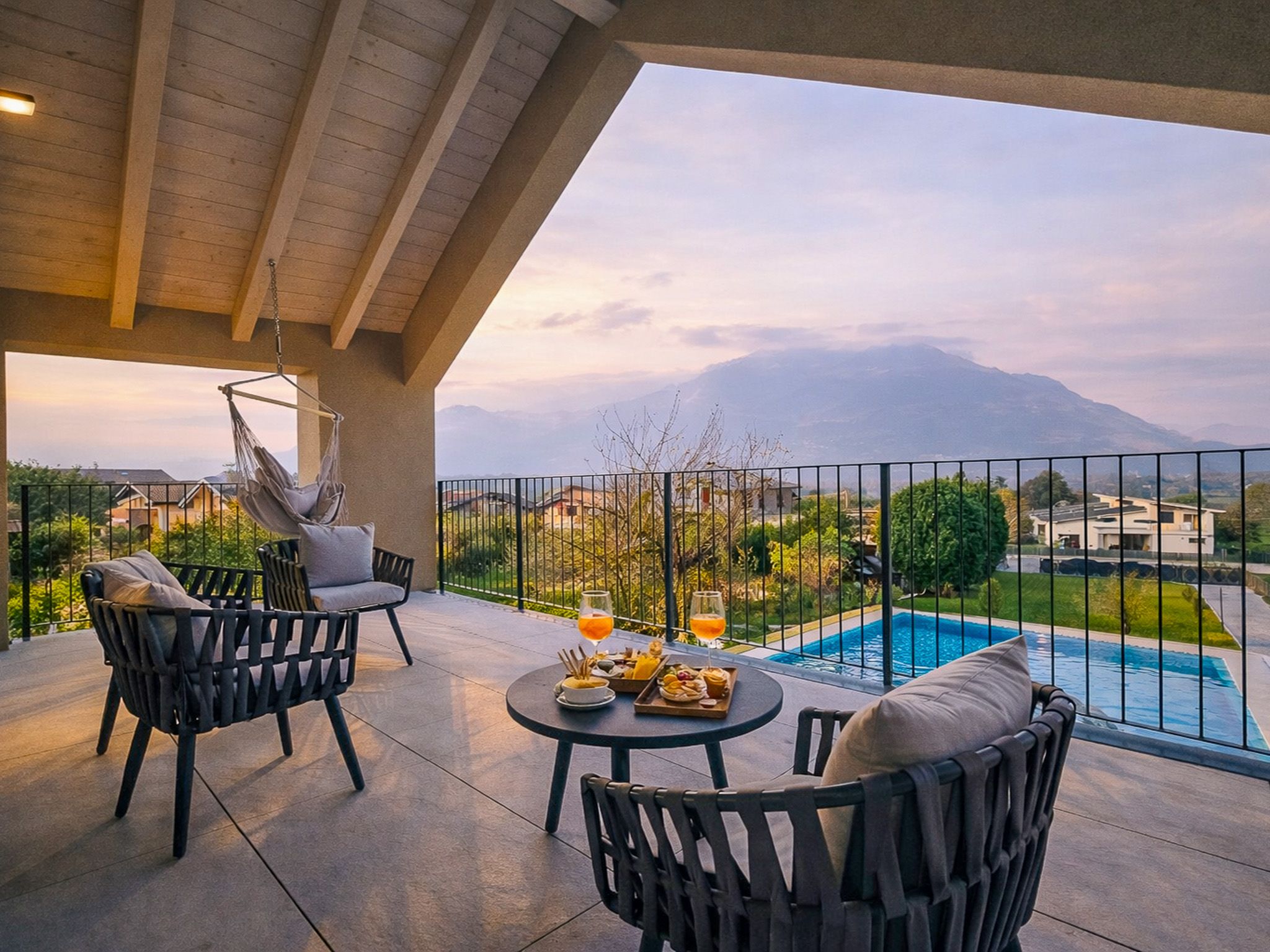 Die Villa Tarca bietet mehrere einladende Außenbereiche an. Die großzügige, überdachte Terrasse im Erdgeschoss mit Esstisch, der weitläufige, langgestreckte Garten sowie der stilvolle Poolbereich. Im Obergeschoss lädt zudem ein überdachter Balkon zum Entspannen ein.