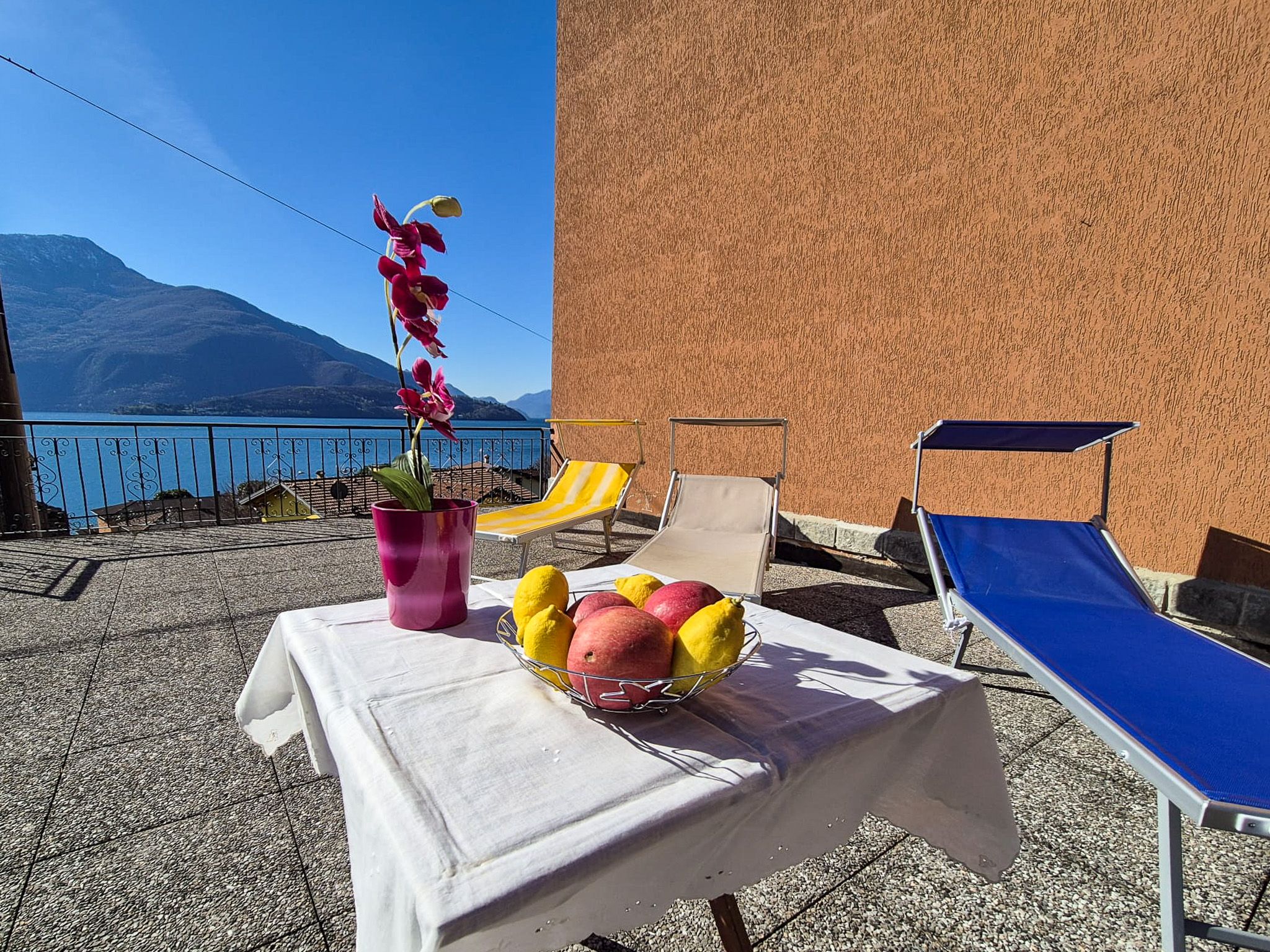Guests are welcome to use the garden. At the front of the flat, the balcony with a dining table invites you to linger and offers a stunning... panoramic view of the lake and mountains. To the side, there is a larger terrace with sun loungers and space for sunbathing.