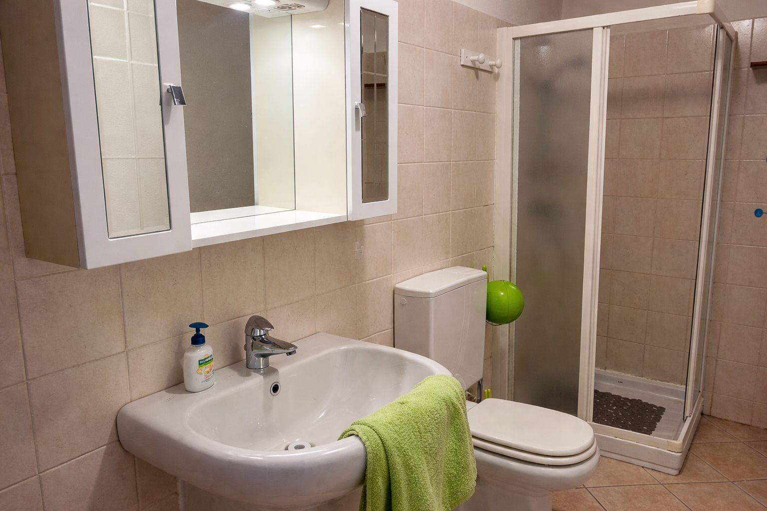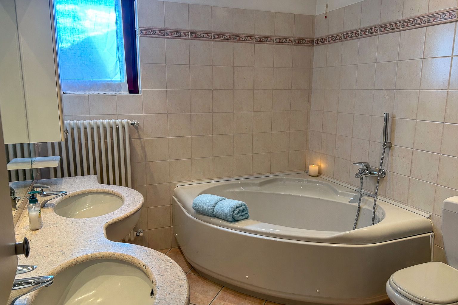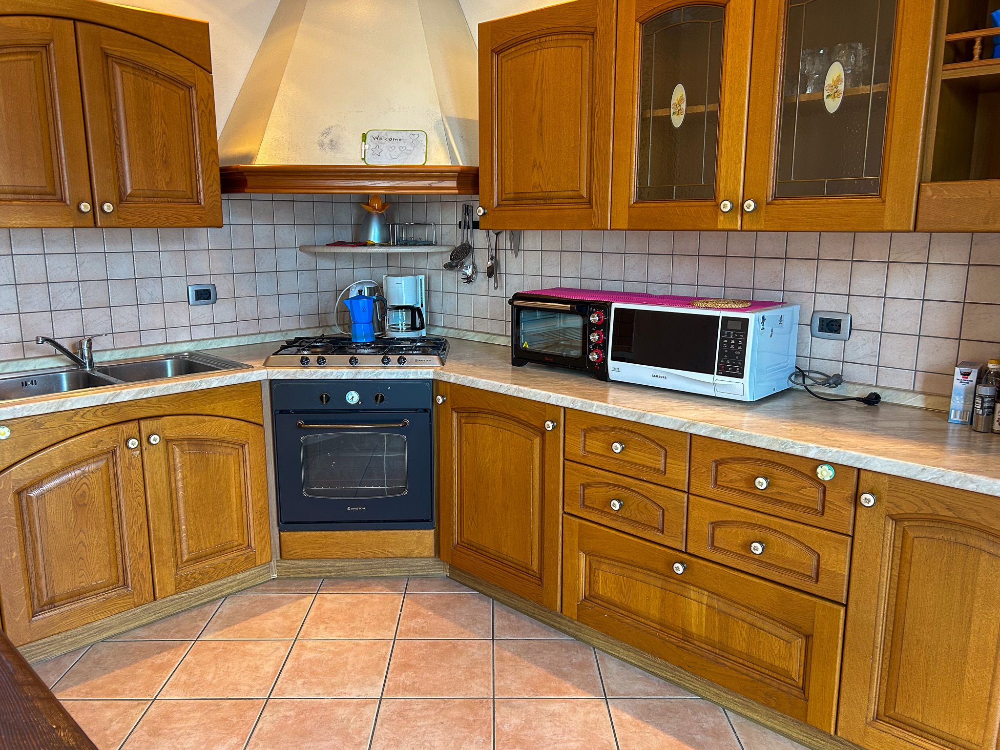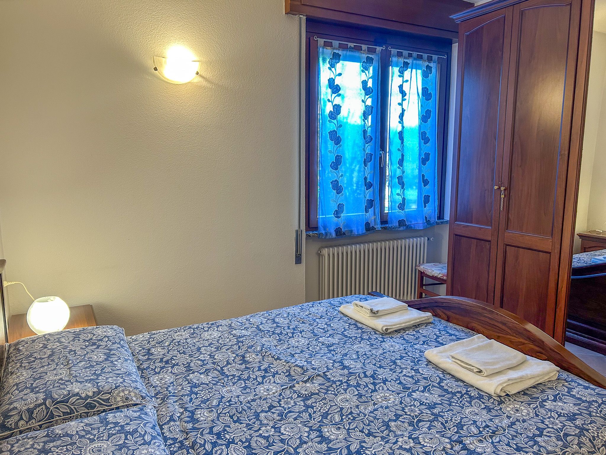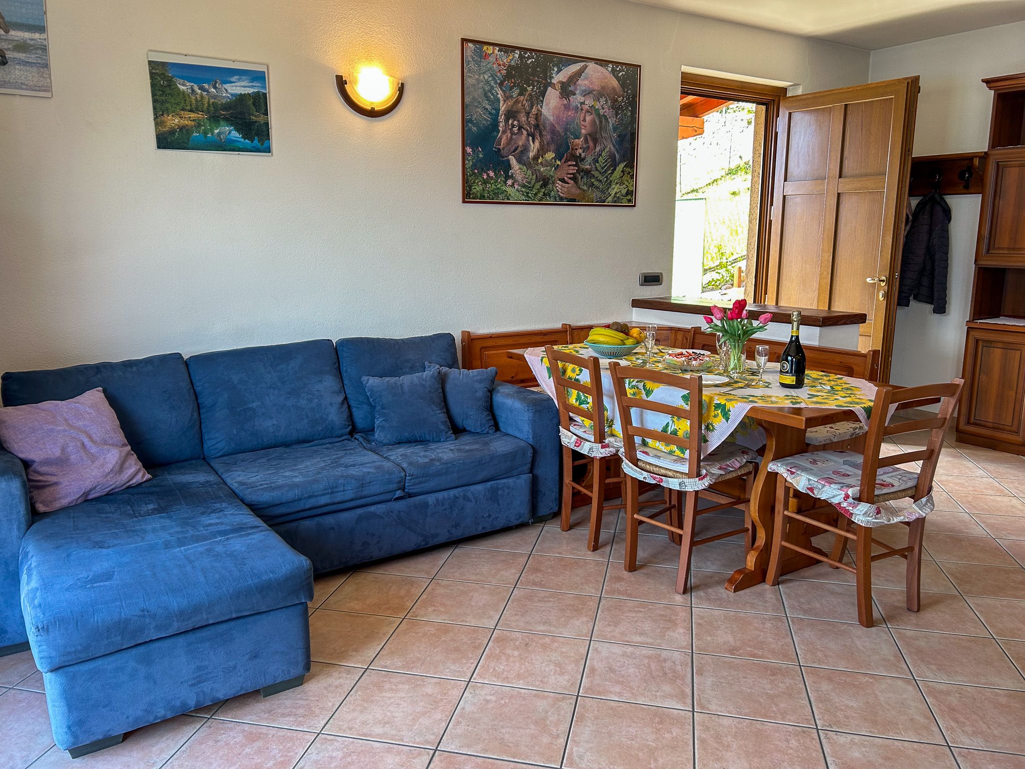 The apartment is cosily furnished with Lombard wooden furniture and light-coloured tiled floors.