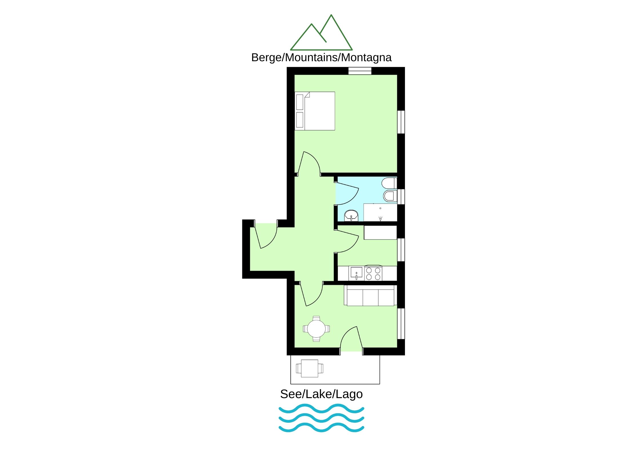 The small hallway leads to the individual rooms: the living room facing the lake has a dining table, a sofa set with a double bed; with access to the balcony.