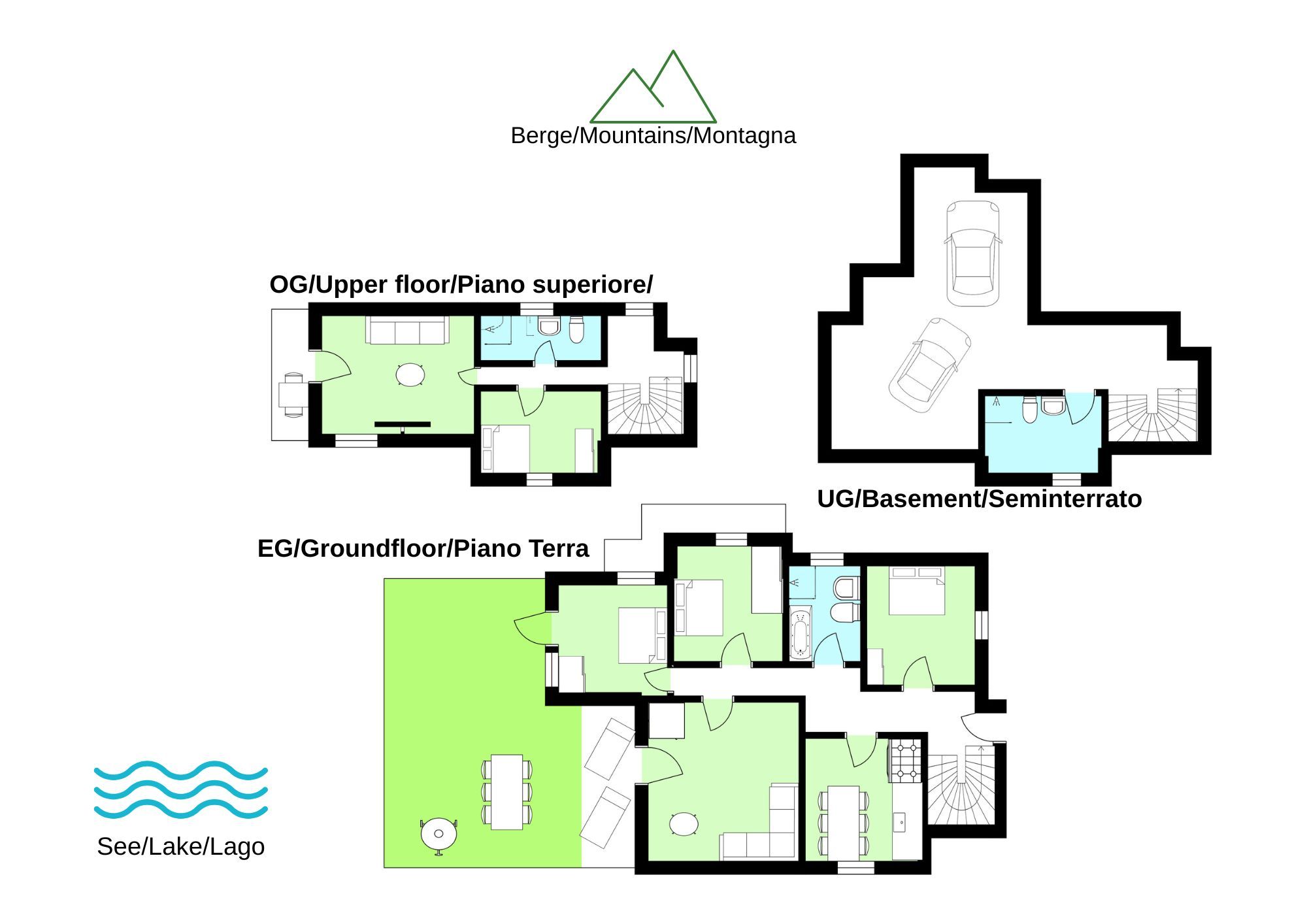 Upper floor: 3 bedrooms, 1 bathroom, roof terrace with lake view