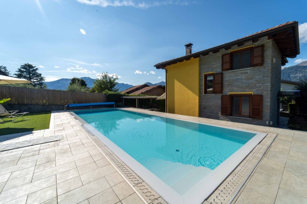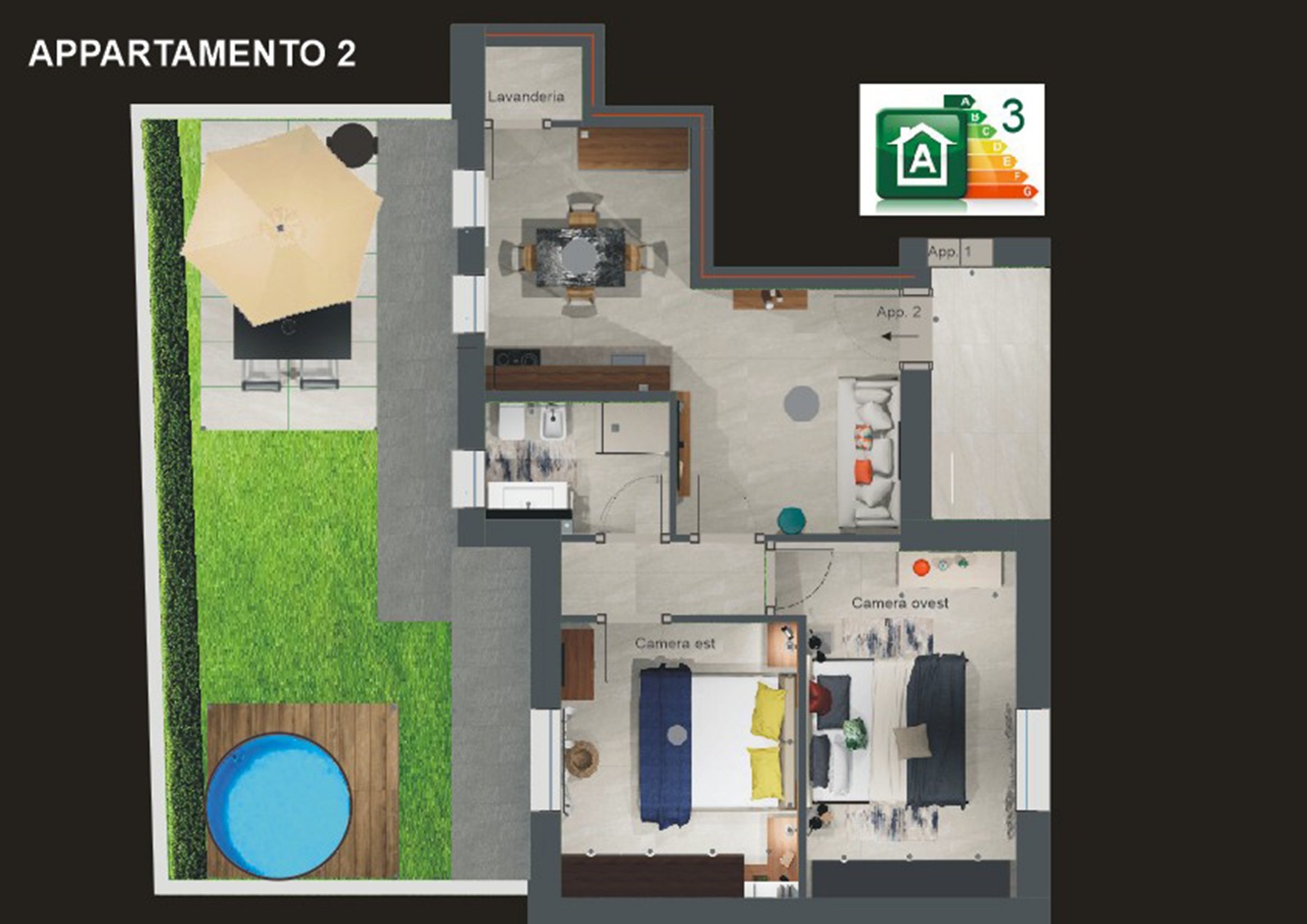 Features include underfloor heating, a heat pump, and a dedicated 3 kWh photovoltaic module for energy savings. Ideally located just 5 minutes from the lake, with shops, schools, and kindergartens nearby. Switzerland is just a few kilometers away, and Milan is 50 km away. Completion is expected at the end of May. Photos are for illustrative purposes only.