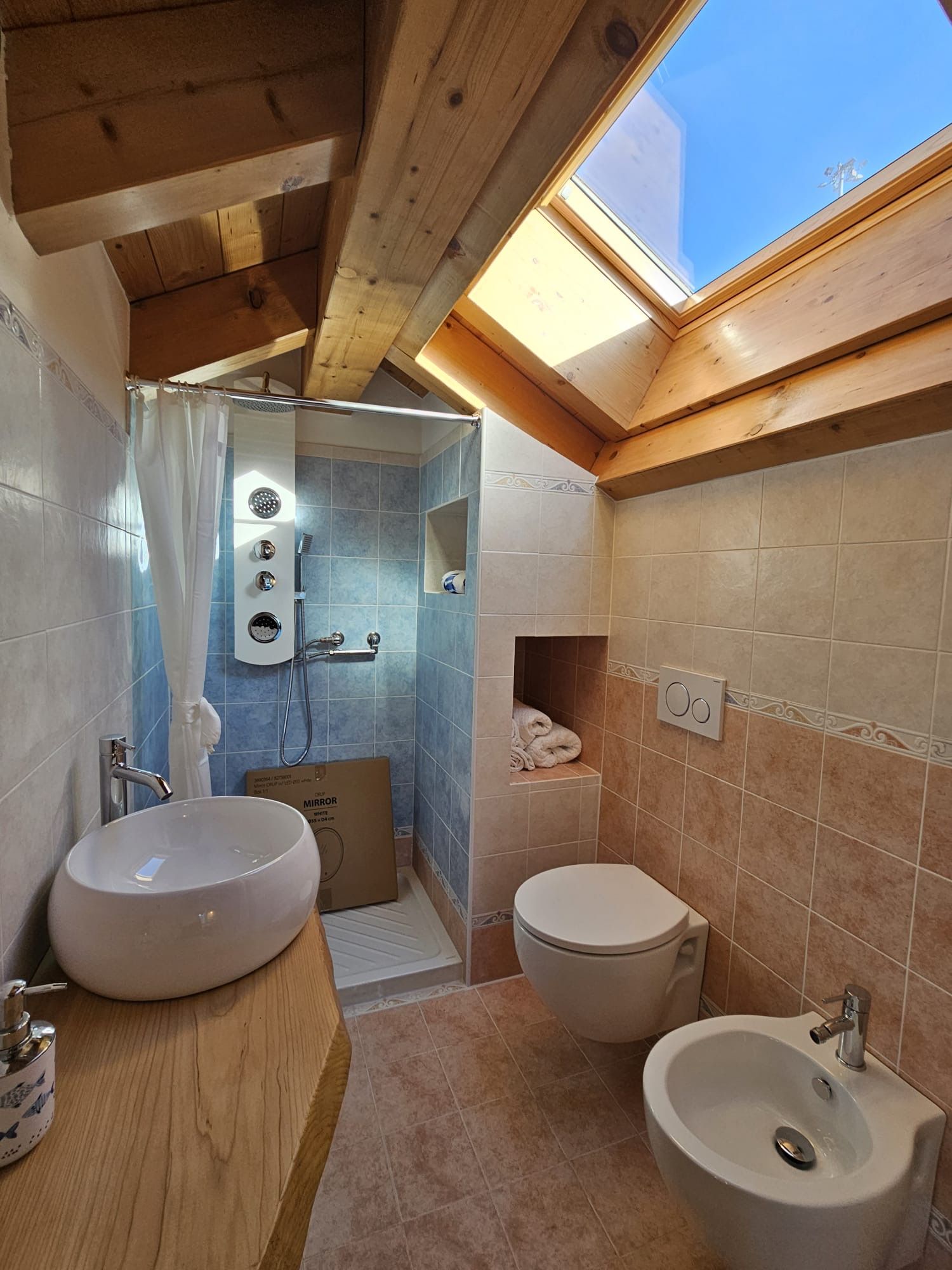 A staircase leads to the upper floor, where there is another open-plan sleeping area with a double bed and an additional bathroom with shower, washbasin, toilet and bidet.