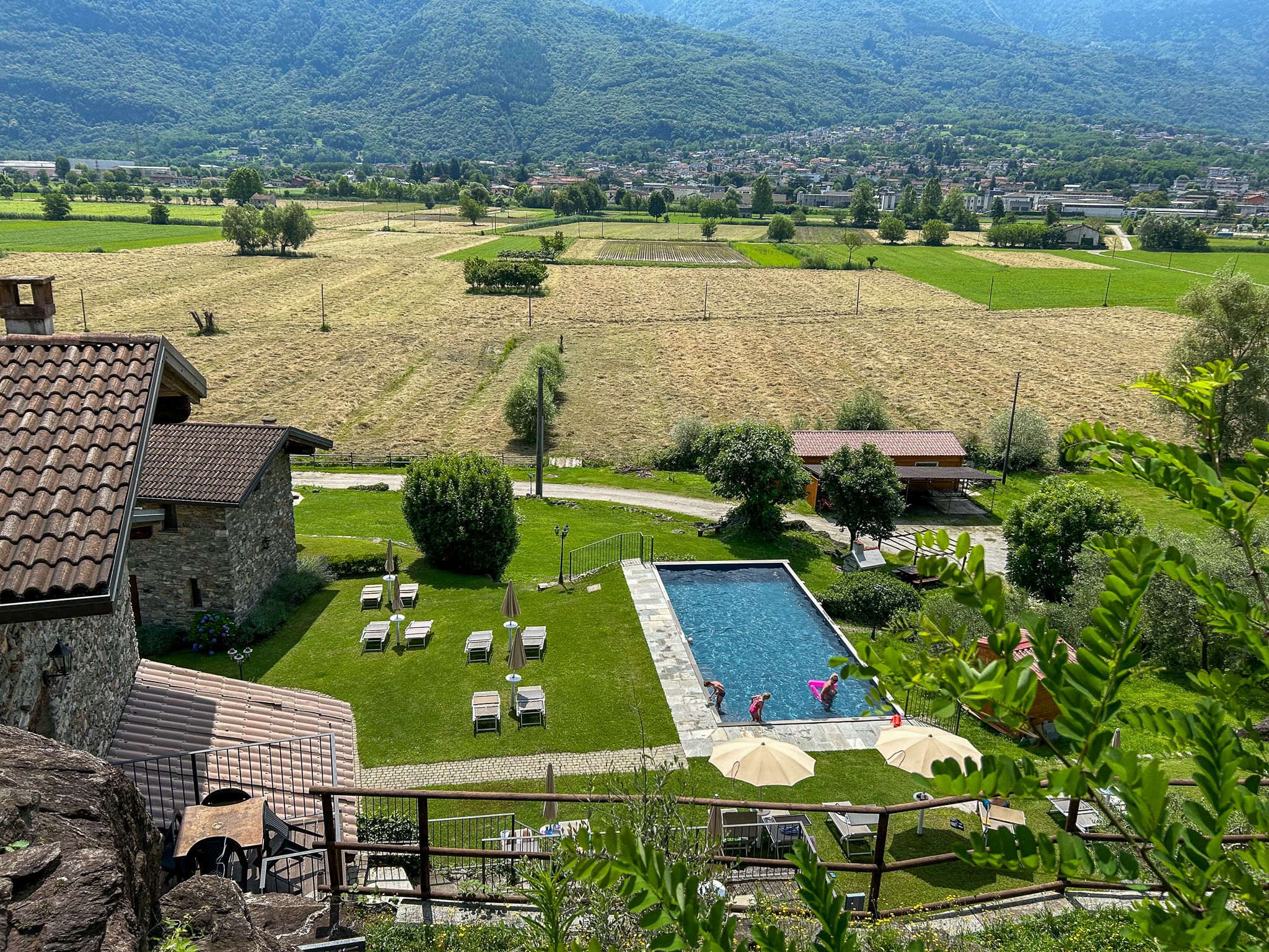 Small garden with sun loungers overlooking the pool integrated into the rock from the living area.