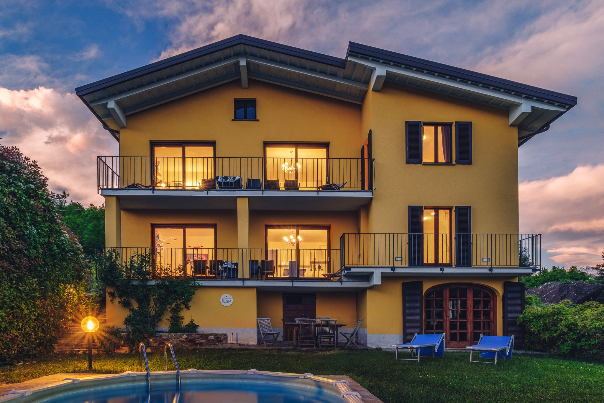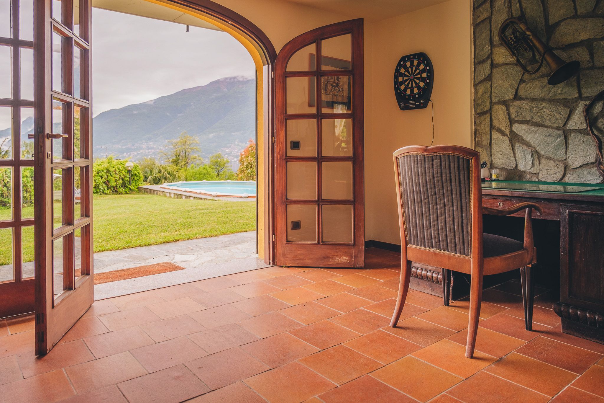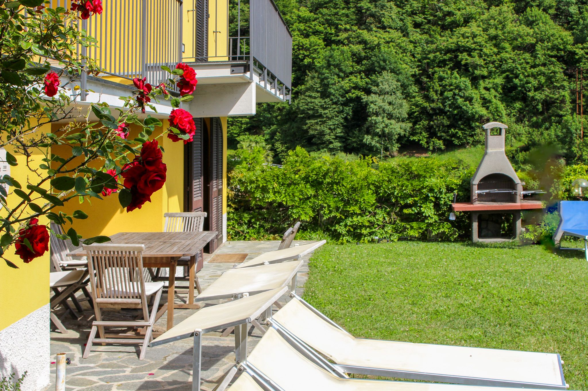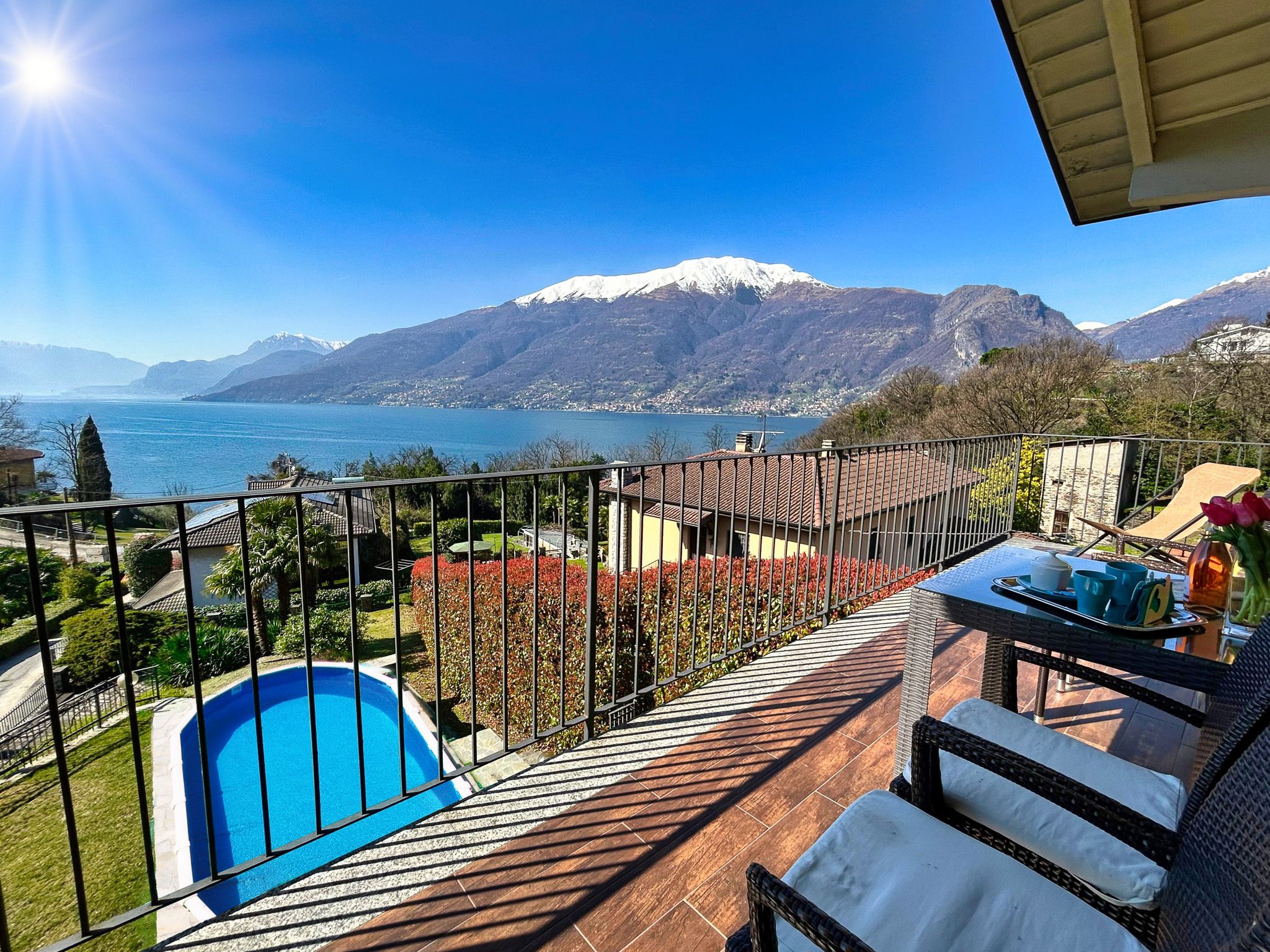 The holiday villa "Mimosa" with two holiday flats is situated in a paradisiacal hillside location embedded in the hilly landscape only 250 m from the lake and has a fascinating view far to the south of the lake and the surrounding mountains. The villa is surrounded by a lot of nature and beautiful villas and residential houses. The garden facing the lake is ideal for sunbathing. A highlight is the rock garden around the house, overgrown with palms and other southern plants. Facing the garden with pool and barbecue, there is a cosy fireplace room with rustic seating area with room for everyone, with board and card games, ideal for private family celebrations by arrangement. Near the barbecue is a garden seating area.  Your holiday resort Olgiasca is located on a headland, which is one of the top holiday locations on Lake Como. North of Olgiasca, about 5 minutes away by car, is Colico with good shopping facilities and a beautiful lakeside promenade as well as Lombard restaurants. From the pier you can reach all the attractive towns around the lake. A regional train takes you from the small local train station in Colico to the fashion metropolis of Milan without changing trains.