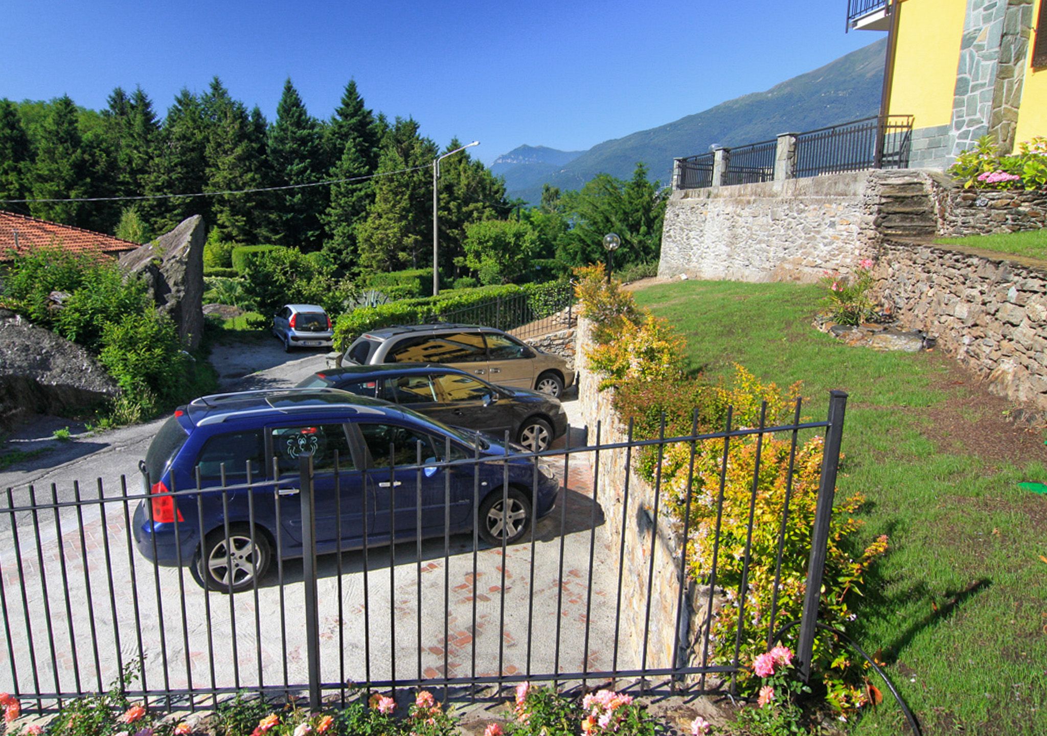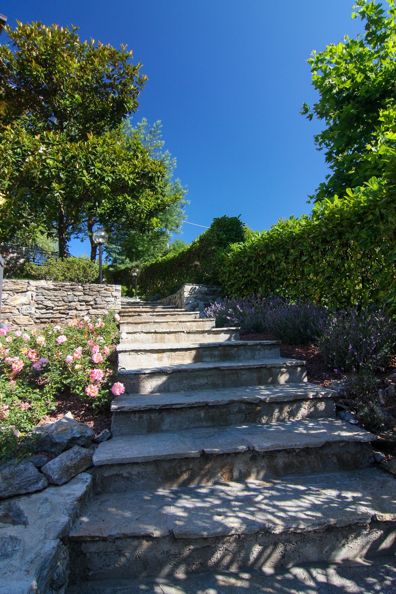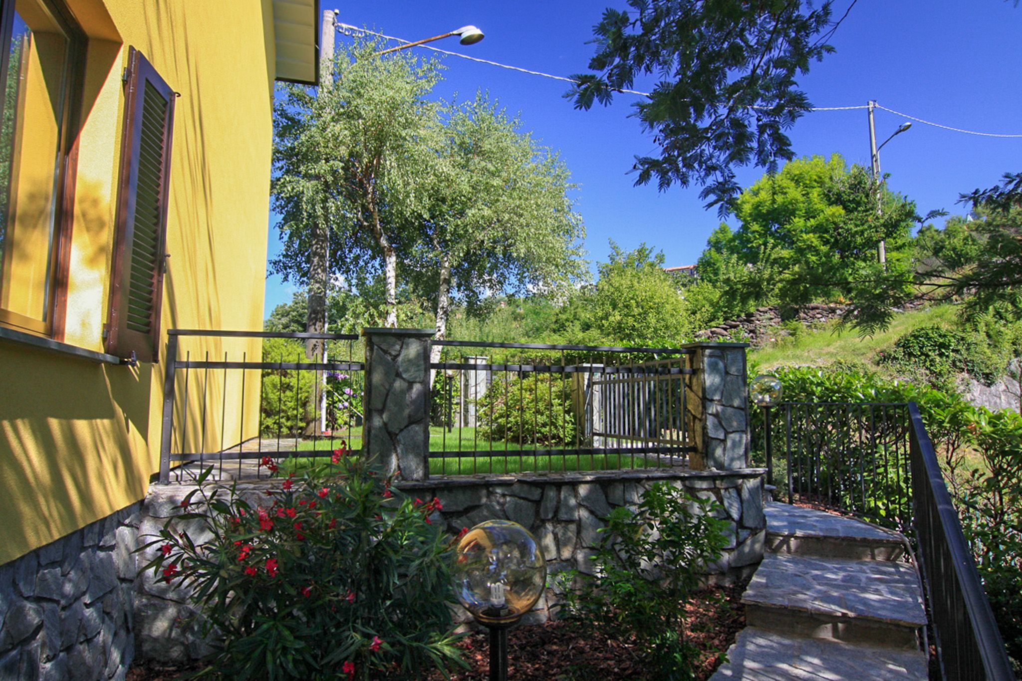A natural stone staircase leads from the parking spaces through the garden to the entrance of the house.