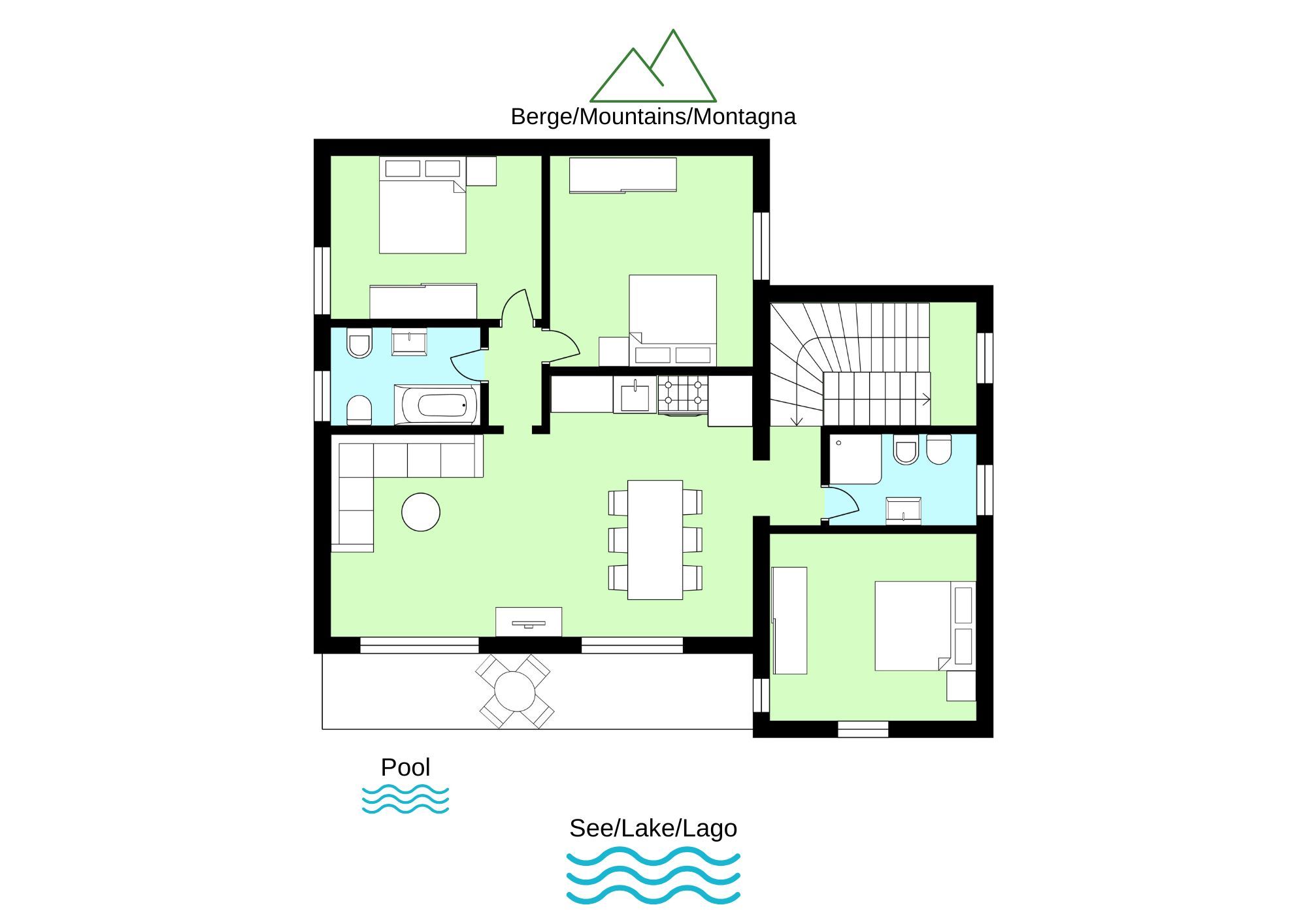 1 double bedroom to the lake side with access to the balcony, bathroom 2 double bedrooms to the garden side with bathroom.