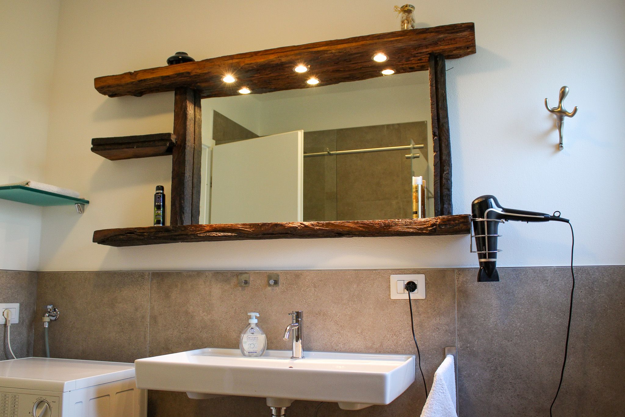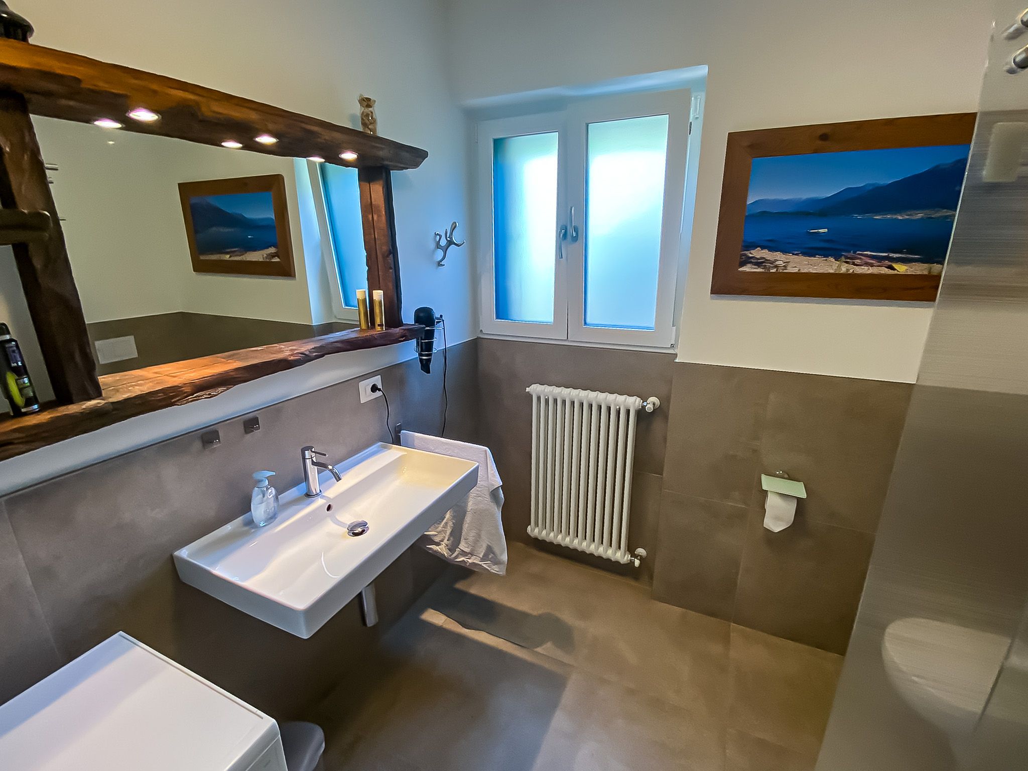 The bathroom has a washbasin, large ground-level shower with rainwater showerhead and WC.