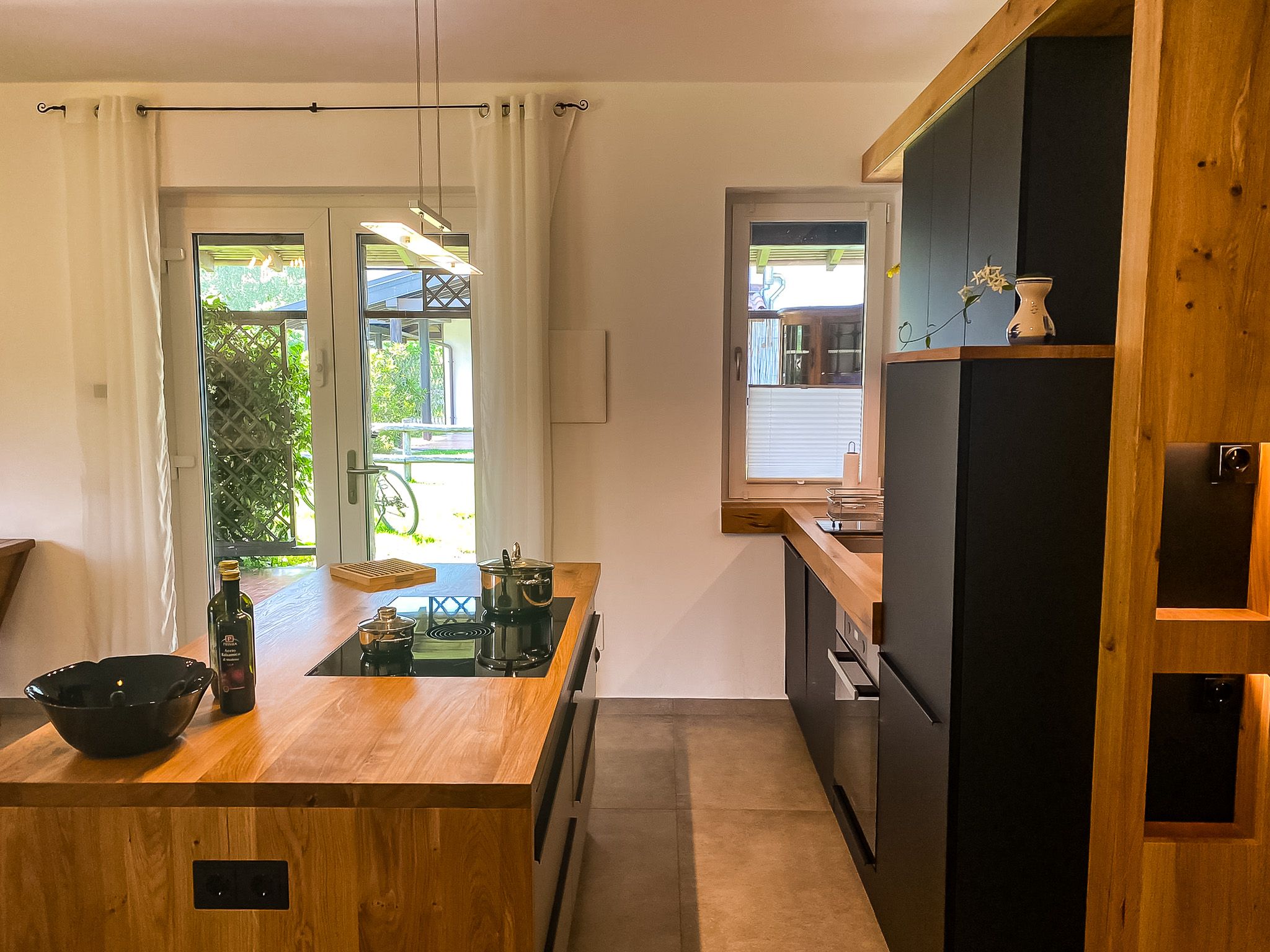The kitchen with modern kitchen island has an induction cooker as well as a hot air oven and good cooking and tableware.