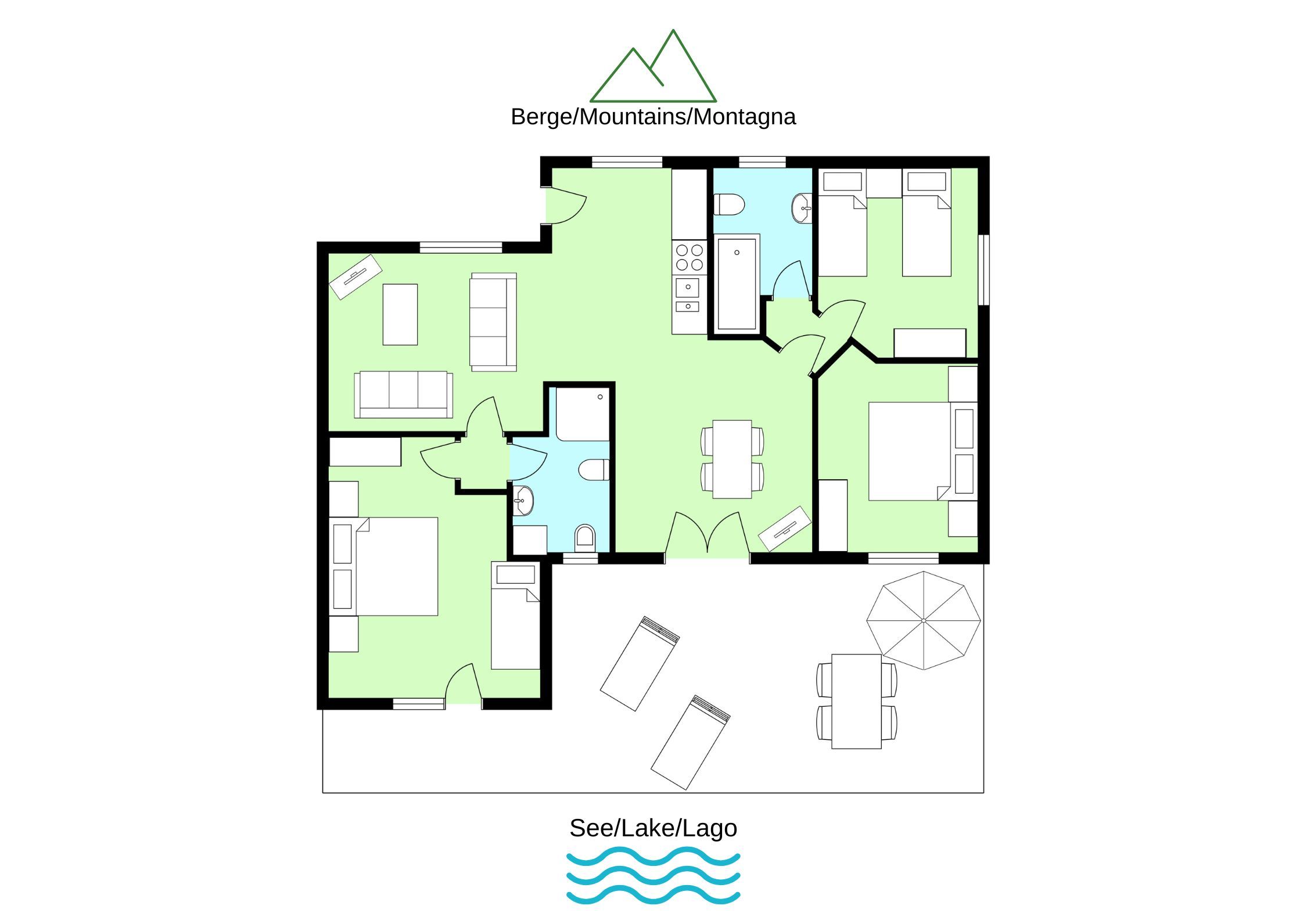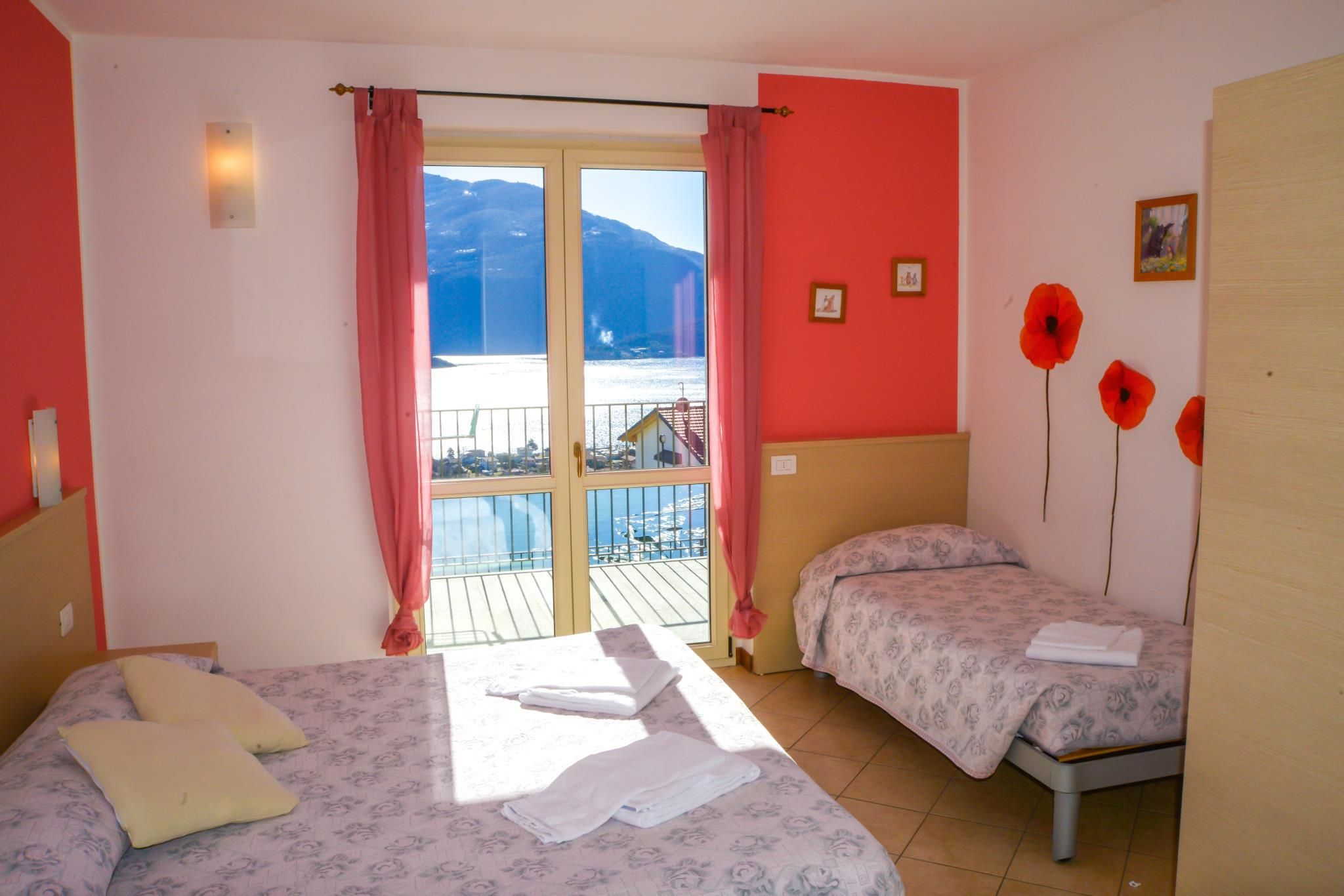One triple room, two twin rooms (beds can be put together), all with partial lake view, offer space for the whole family.