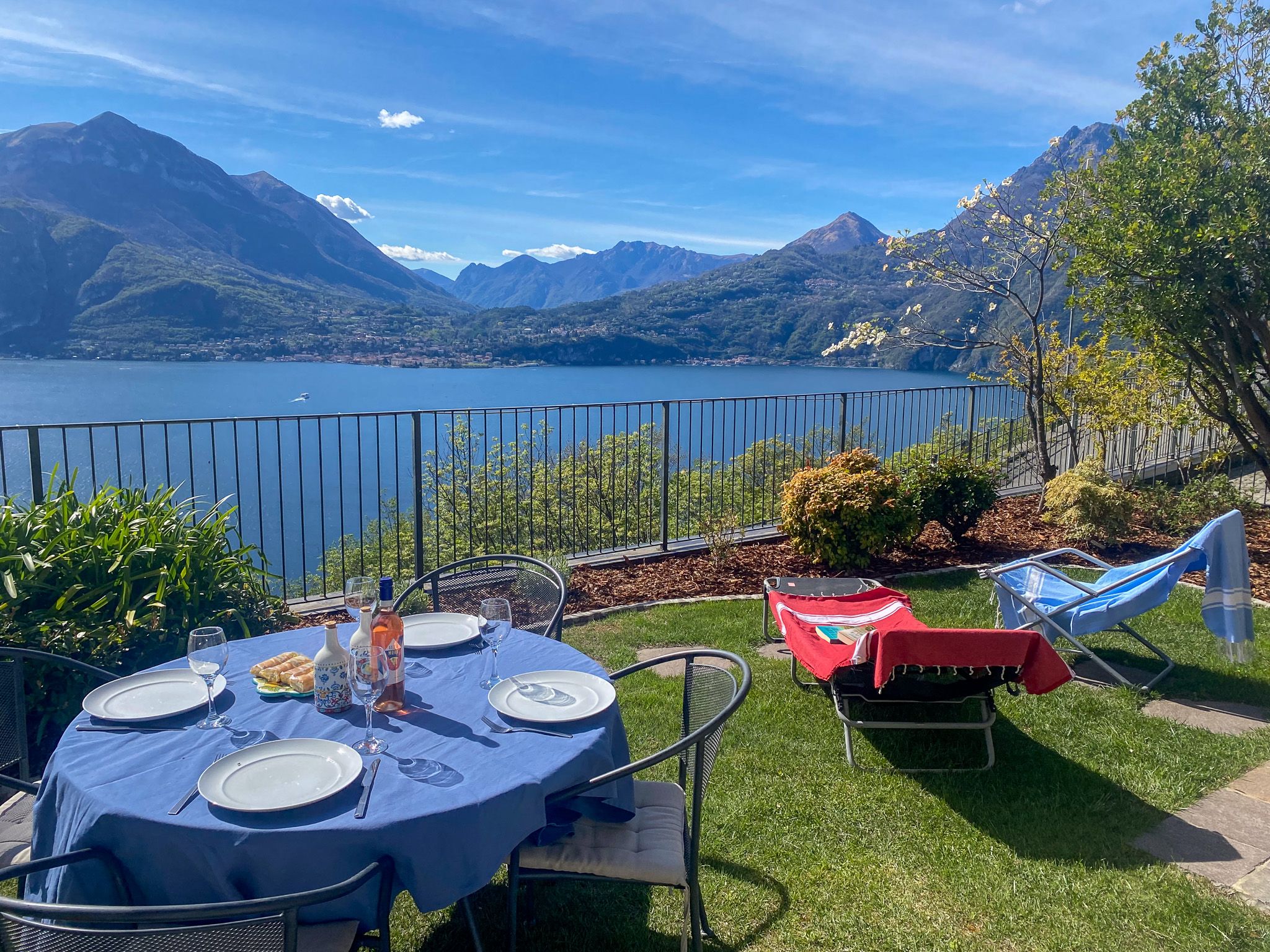 Die Wohnung bietet einen grandiosen Blick... es reicht, am Abend auf dem Sofa zu sitzen und aus der großen Fensterfront die Lichter am gegenüber liegenden Ufer zu bestaunen um glücklich zu sein! Der Garten bietet natürlich auch diese Sicht. Er ist, da es ein Eckhaus ist, relativ groß... mit mehreren Sonnenliegen und 2 Sitzplätzen mit Tischen. Die Wohnung ist zweckmäßig eingerichtet war leider nicht so sauber wie gewünscht. Der Ort Varenna ist entweder über die Serpentinenstraße mit dem Auto erreichbar oder über einen Fußweg den man nach der 1. Kurve findet. Der Weg führt relativ steil und recht uneben Bergab (gutes Schuhwerk ist ratsam). Wir haben ohne zu hetzen ca 20 Minuten hinunter und ca 25 Minuten rauf gebraucht. Ein Taxi vom Bahnhof aus hat ca 11€ gekostet. Varenna selber ist durch den Bahnhof (1 Stunde bis Mailand klappte super) und den Hafen (mit der Fähre kommt man prima überall hin) strategisch optimal gelegen. Der Service klappte hervorragend.