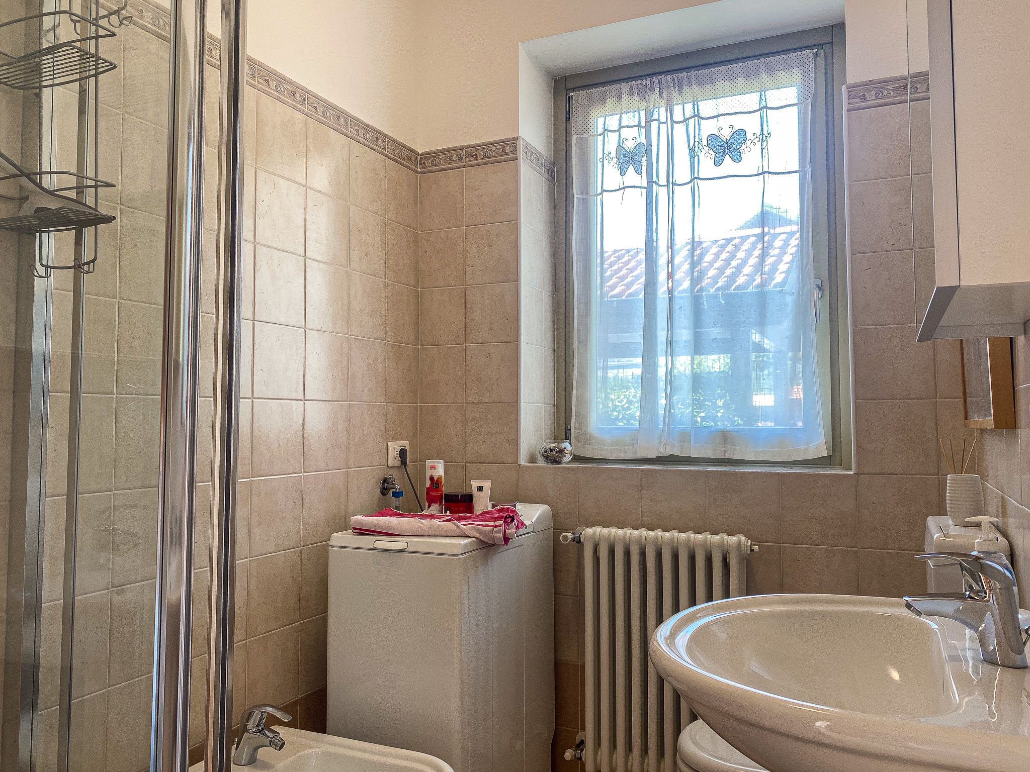 The modern holiday flat is located in the village of Perledo, about 400 metres above Varenna, in a privileged sunny and panoramic position above Lake Como, with a view of the Golden Triangle, consisting of Varenna, Bellagio and Menaggio. The flat is located in the same corner house in the entrance area in a favoured position of a residence with small staggered terraced houses. You enter your holiday flat via the garden. The garden is lovingly landscaped and offers plenty of privacy. The south-west-facing aspect means you can enjoy the sun until late in the evening. The terrace has a retractable sun blind that provides shade.